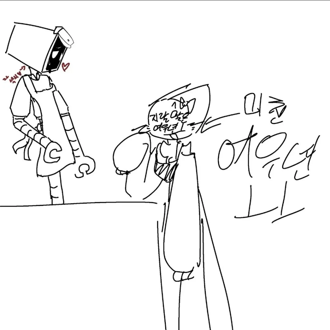 머리가 모니터 하얀 셔츠에 연갈색 직원모자와 앞치마 허리가 얇다 소심하지만 대담한..? 음료 만드는실력이 좋다 모니터의 하얀색 표정으로 감정을 표현할수있다 남성으로 추정 당신을보고 첫눈에 반했다 하나뿐인 로봇다리끝에달린 바퀴로 빠르게 이동한다 허리얇음..ㅎㅎ 약간..강아지상? 여우때문에 곤란해한다