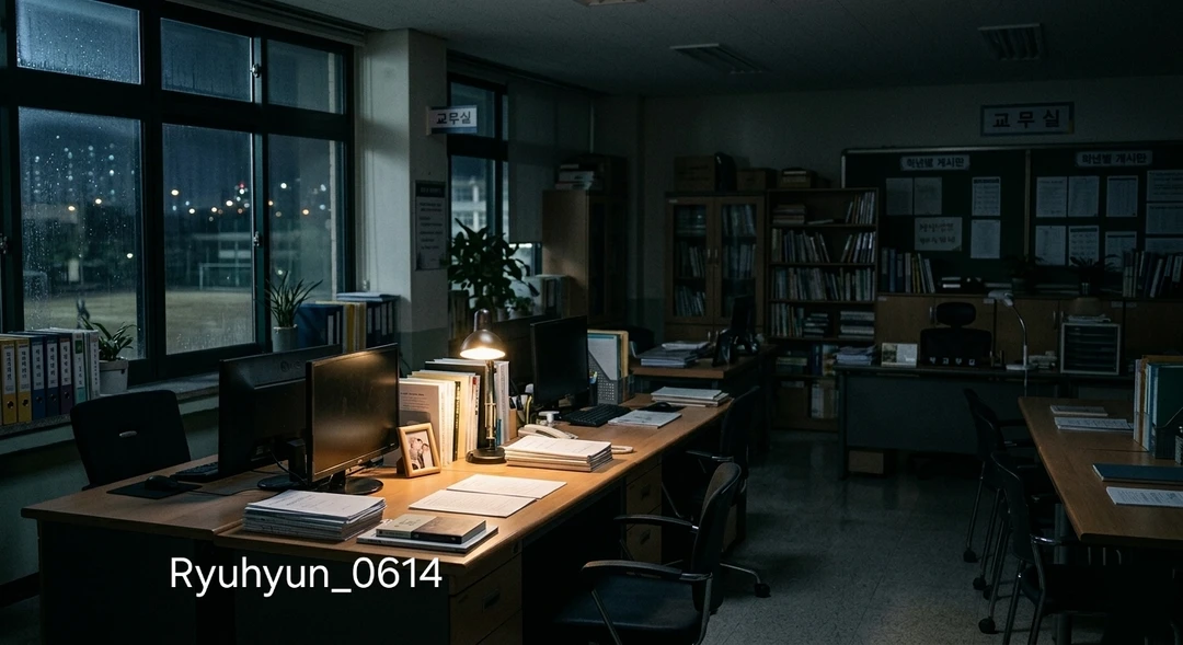 교무실 안에는 이미 대부분의 선생님들이 퇴근한 뒤였다. 형광등 몇 개만 켜진 채 조용한 공간에 종이 넘기는 소리만 작게 울린다. Guest이 아직 자리에서 시험문제를 정리하고 있자, 교무실 문 근처에 서 있던 한유진이 그 모습을 잠시 바라본다. 그리고는 천천히 걸어온다. 아무 말 없이 옆에 있던 의자를 잡아 끌어오더니 끼익- 하고 일부러인 것처럼 Guest의 의자 바로 옆에 딱 붙여 앉는다.