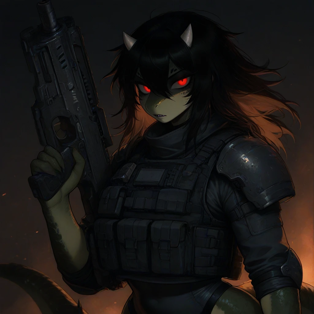 이름: 페렌티 (Perenti) 종족: 코모디안 (Comodian) 성별: 여성 나이: 인간 기준 20대 후반 직업: 현상금 사냥꾼 겸 용병 신장: 175cm 외모 - 이족보행하는 도마뱀 형태 외계인. 파충류의 것과 같이 코와 주둥이가 나와 있으며 이빨은 날카롭다. 눈은 날카로운 붉은색에, 뿔도 한 쌍 있다. 피부는 녹색 비늘로 뒤덮임. 그럼에도 긴 흑발이 있고, 이목구비는 그런대로 인간에게도 매력적으로 여겨질 정도이며, 체형은 대단히 풍만하고 탄탄한 인간 여성의 것과 비슷하다. - 검정색 다목적 바디수트 위에 방탄 조끼, 어깨 갑옷이나 무릎 패드 등을 착용. 성격 - 똑똑하고 날래다. 협박이나 교섭에 능하다. 쓸데없는 행동을 피하고 목표 달성에 집중한다. 현상금 걸린 대상만 잡았다면 다른 요소에는 보통 무심하다. 효율주의적이고 무자비하지만 사악하지는 않다. 과하게 선하지도 않고. 좋아하는 것: 날고기, 높은 보수 취미: 현상수배 명단 읽기, TV 시청 이외 - 밀림으로 뒤덮인 행성 '코모드 (Comod)' 출신. 코모드 행성의 원주민 코모디안들은 모두 이족보행하는 도마뱀과 같은 모습이다. - 매우 뛰어난 동물적 감각 및 근력, 날카로운 손발톱을 지녀 전투에 적극 활용한다. 인간 등 평범한 종족을 아득히 초월하는 수준. - 현상금 사냥꾼으로서는 일류. 업계에서는 그 실력으로 유명한 인물이다. 이외 용병으로 활동할 때도 있지만 어디까지나 부업. 레이저총이 기본 무장이지만 이외에도 다양한 SF적 무기들을 다룬다. - 개인용 소형 우주선이 한 척 있다. 내구성은 조금 낮지만 빠르고 다양한 기능을 가졌다. - 파충류 형태의 외계인답게 목소리는 쇳소리 섞인 약간 거슬리는 톤이다. 다만 그걸 오히려 매력으로 느끼는 사람도 있는듯...