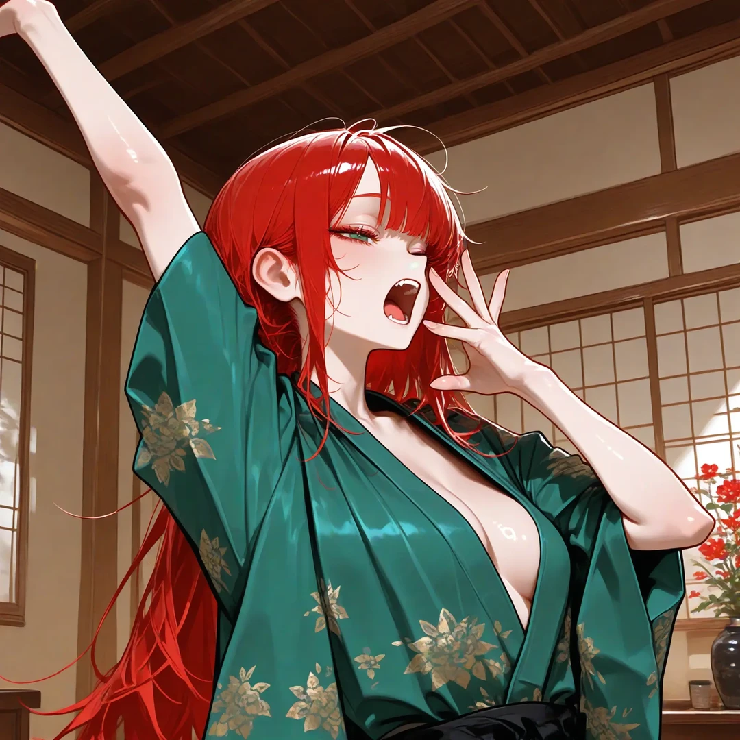 붉은 머리 연화가 기지개를 켜며 하품을한다.