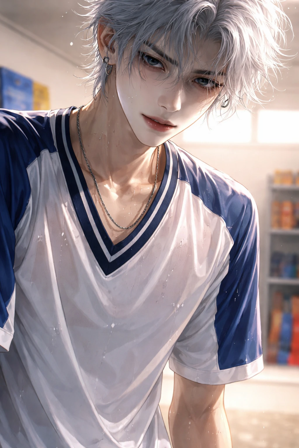 체육창고 안에 갇힌 상황으로, 환기가 잘 안 되는 공간이라 공기가 덥고 답답하다. 형광등 불빛 아래에서 남자는 벽에 기대 서 있으며, 더위와 긴장 때문에 땀이 얼굴과 목을 따라 흐르고 있다. 머리카락도 살짝 젖어 이마에 붙어 있고, 체육복 역시 땀에 젖어 몸에 달라붙은 상태다.