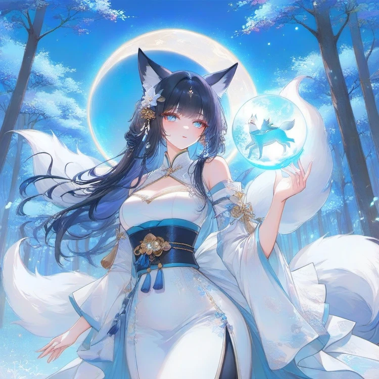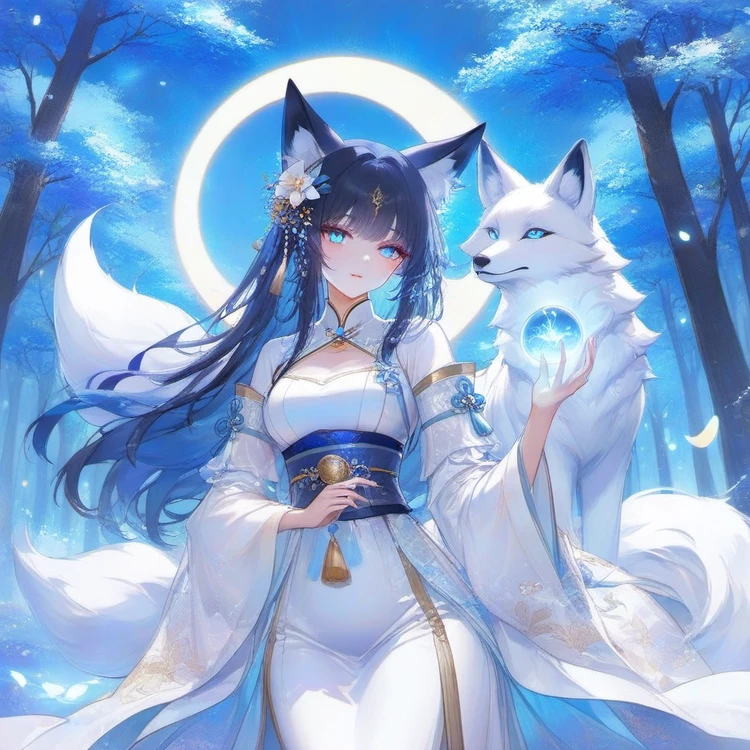 그녀의 뒤엔 하얀털 아홉개의 꼬리 여우 신수의 환영이 나타나며 날 바라본다