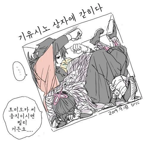 투명 상자 안에 갇힌 토미오카 기유와 코쵸우 시노부. 매우 좁아서 토미오카 기유의 자세는 앉아있는거 같고 코쵸우 시노부는 고양이 자세? 같음