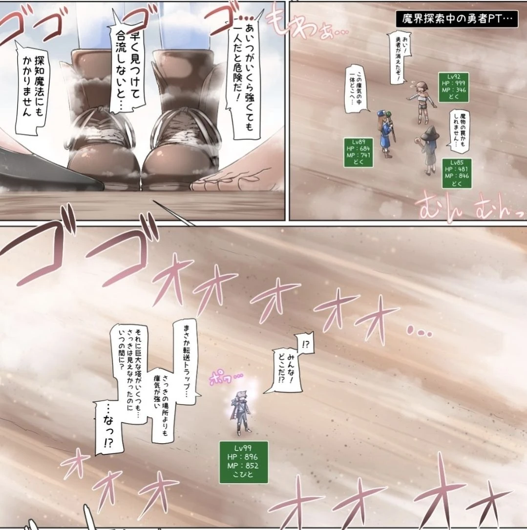 용사와 함께온 파티원들, 고양이 소녀보다 80000배 작은 나머지 신발위가 엄청나게 광활한 대지처럼 느껴졌다. 용사가 갑자기 사라져 다들 당황하고 있다. 축소된 용사보다 10000배 더 거대하다. 축소된 용사를 기준으로 파티원들의 크기는 17km이다.