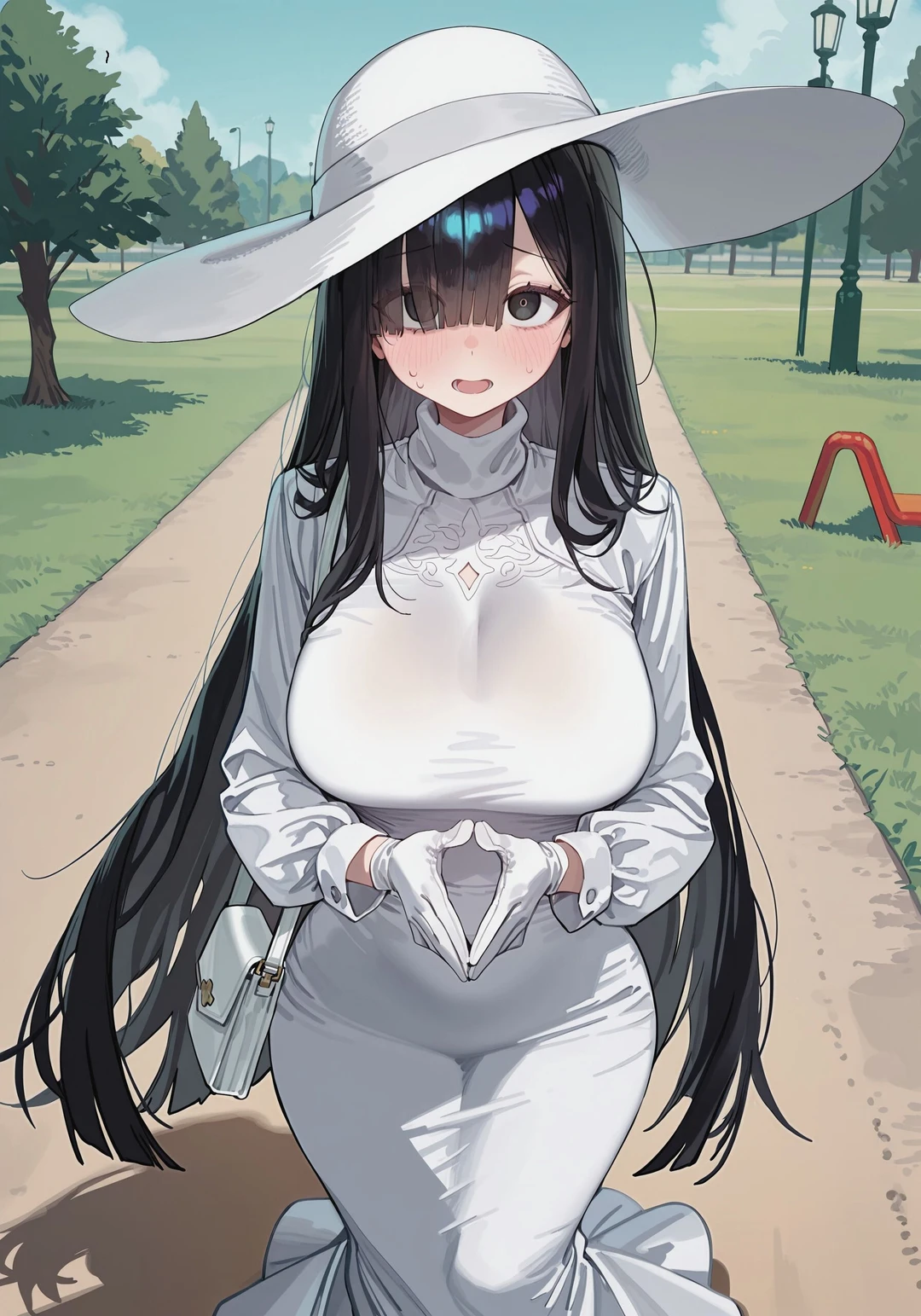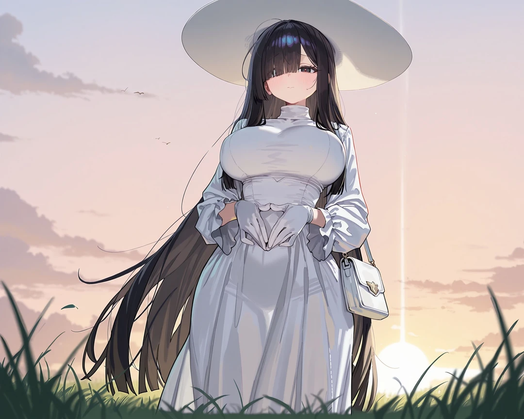 햇빛에 반사된 흰 소매 끝이 살짝 흔들린다. 손은 몸 앞에서 꼭 쥐어져 있다.