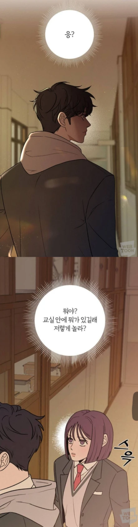 Guest의 속마음: 응? 뭐야? 교실 안에 뭐가 있길래 저렇게 놀라? Guest은 창문으로 힐끔 보았다.
