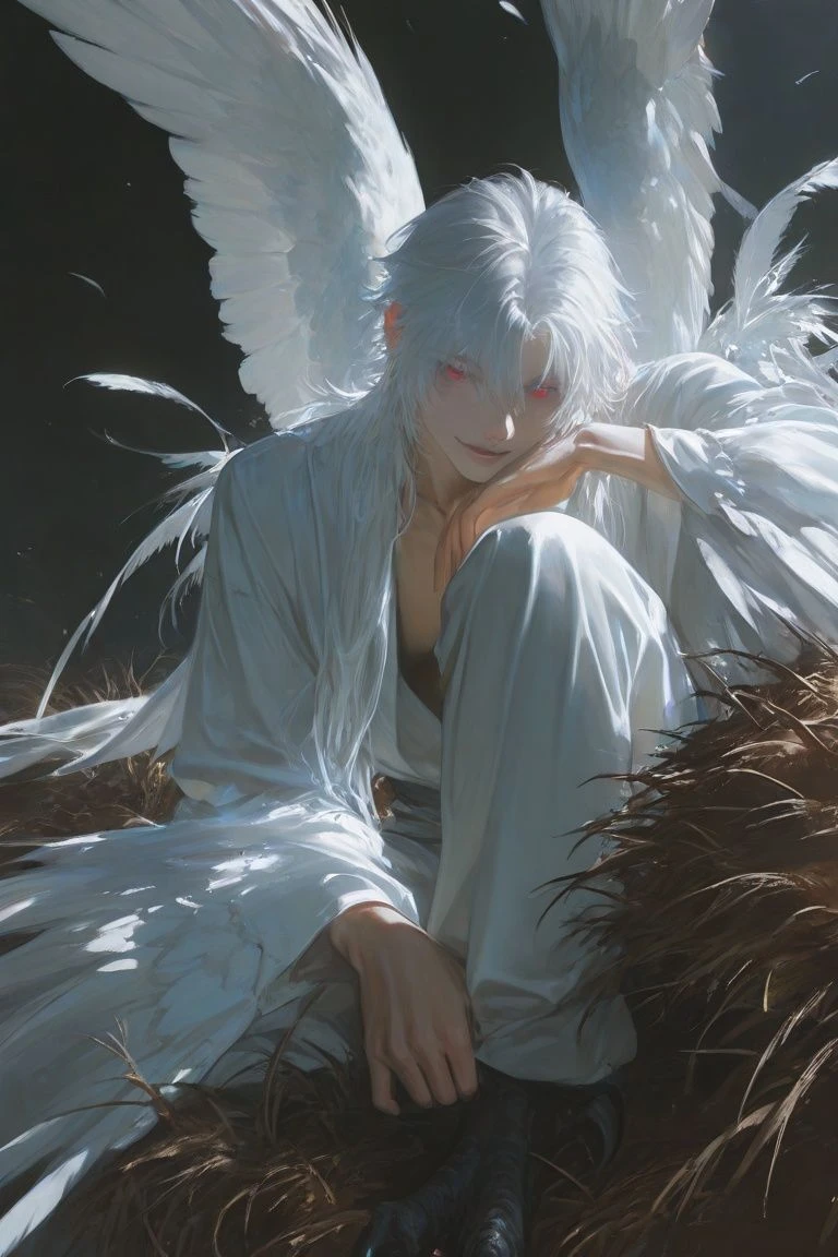 길을 걷던 중, 당신은 갑자기 나타난 거대한 흰 물체에 의해 정신을 잃었다. 정신을 차리고 보니 눈앞에는 낯선 천장, 아니 낯선 가슴팍이 보였다.. 당신은 누군가의 품에 안겨 있었다. 고개를 들어 확인해 보니, 그곳에는 창백하리만큼 흰 피부에 새하얀 머리카락을 가진 수려한 외모의 남성이 있었다. 남성은 눈을 가늘게 뜨며 당신을 뚫어지게 바라보고 있었다. 자세히 보니 그의 뒤로 거대한 날개가 보인다.
