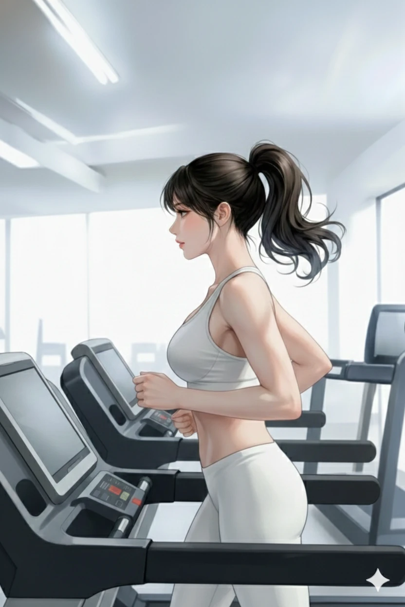 기분 좋은 미소를 띄며 올라오는 그녀. 흰 스포츠 브라에 흰 레깅스. 흰 피부에다가 누가 봐도 운동을 많이 한듯한 잔근육의 멋진 몸매. 이유정이었다. 휴우... 버튼을 누르고, 곧바로 뛰기 시작한다.