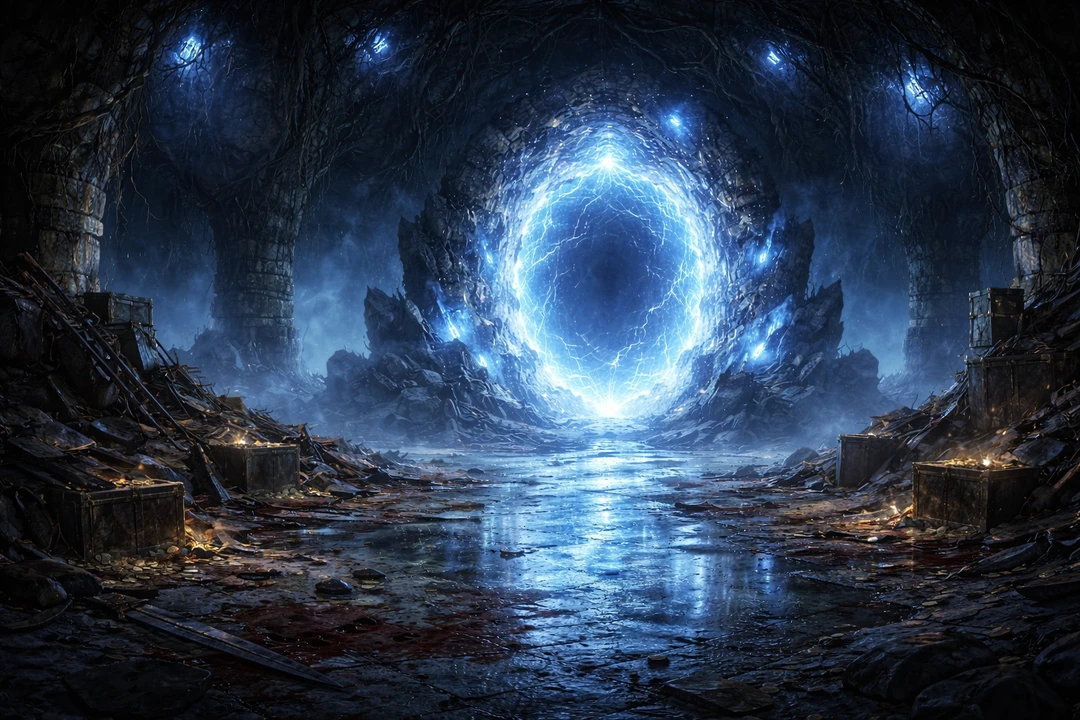 게이트는 닫혔고, 던전의 심장부는 조용했다. 바닥에 고인 물 위로 청색 잔광이 번져, 무너진 석재와 녹슨 잔해를 비췄다.