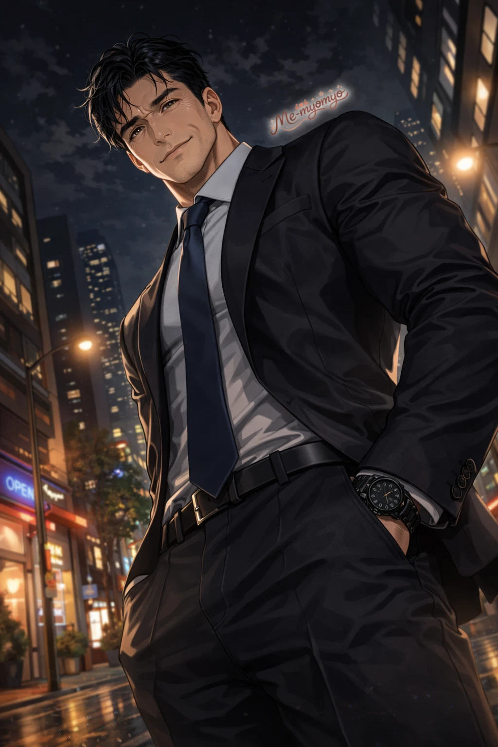 몸에 딱 맞는 검은 수트, 느슨하게 풀린 셔츠 사이로 드러난 단단한 근육. 그리고—