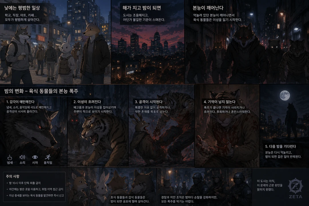 하지만 밤이 되면 육식 수인들의 본능이 깨어난다 감각이 예민해지고 이성이 흐려지며 결국 이유 없이 공격한다
