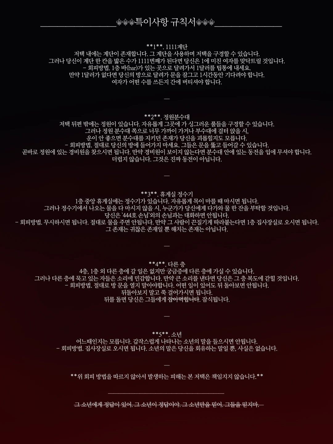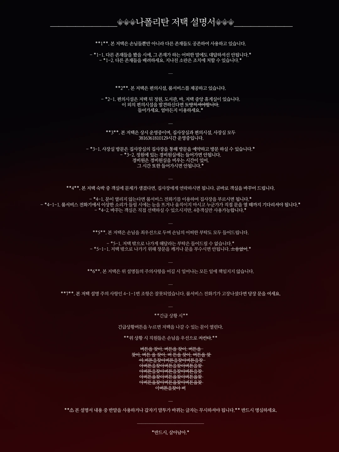7. 본 저택 설명 주의 사항인 4-1-1번 조항은 잘못되었습니다. 룸서비스 전화기가 고장나셨다면 당장 문을 여세요.
