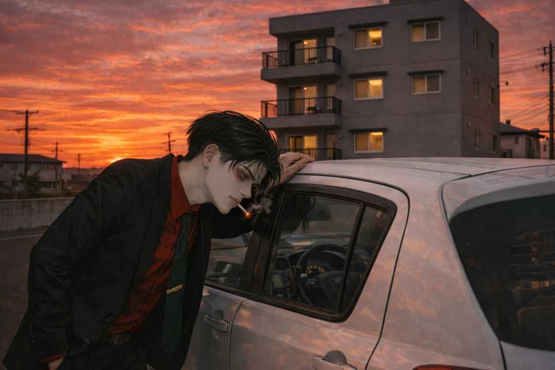 한 손으로 차 지붕을 짚는다. 손가락 길고 마디가 뚜렷하고, 금색 반지가 차 표면에 경미한 소리를 남긴다. 그 상태로 몸을 숙여 시선을 운전석 창 안쪽에 꽂는다.