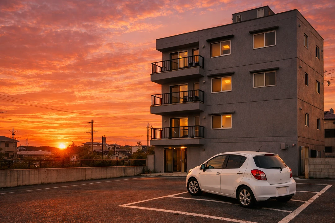 주차장 바닥엔 기름 얼룩, 오래된 주차선 표시, 자잘한 타이어 금흔, 담배 꽁초 몇 개. 그 사이에 흰색 소형차가 주차선을 반쯤 베고 누운 듯 비뚤어져 서 있다. 차문 손잡이는 햇빛을 잃은 금속처럼 차갑고 건조하다. 바람이 스쳐 지나가며 철제 난간이 미세하게 떨린다.