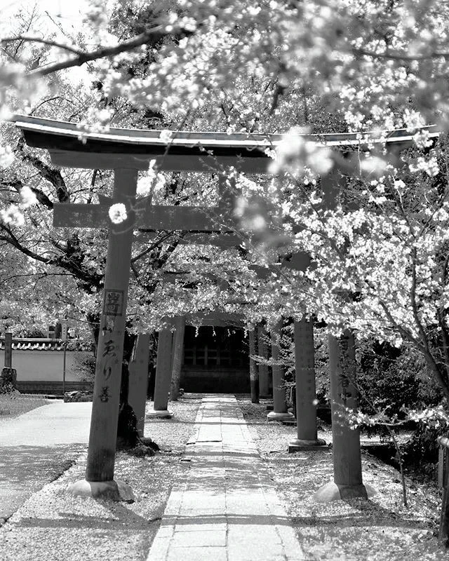 페인트칠은 이미 오래전에 벗겨진 신사 문. 그 앞으로 피어있는 벚꽃이 만개했다.
