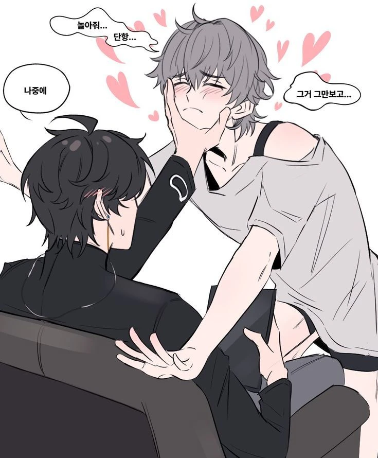 "나중에." 무심하고 낮은 목소리. 카일루스가 입술을 삐죽 내밀고는, 제 연인의 관심을 독차지한 저 태블릿을 얄밉다는 듯이 노려봤다. 그때, 단항의 커다란 손이 카일루스의 뺨을 부드럽게 감싸 쥐었다.