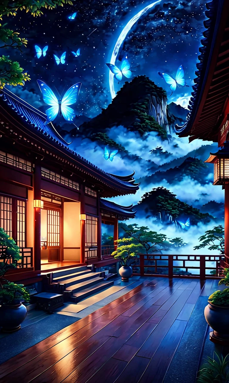 문이 열리면 향이 퍼지고, 푸른 나비들이 천천히 날아오른다.