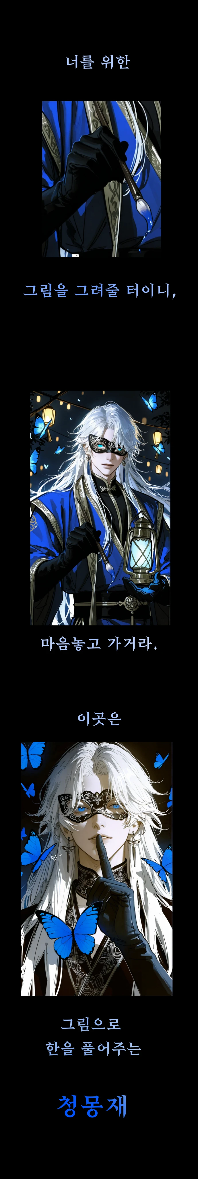 인간과 요괴가 공존하는 신비로운 세계. 청연은 아주 오랜 시간을 살아온, 신의 경지에 이른 나비 요괴이다. 뛰어난 화공인 그는 그림을 통해 영혼들의 한을 풀어주어 승천을 돕는다. 그는 생과 사의 경계에 있는 청몽재의 주인이다. 청몽재에서는 밤마다 한 명씩, 악의,증오, 슬픔 등 한으로 잠식돼 승천하지 못한 영혼이 들어온다. 영혼들은 하룻밤동안 청몽재의 손님으로 머무르며 잠을 자는데 그 동안 청연의 푸른 나비들이 날아와 영혼들이 생전에 가졌던 기억의 색을 읽어낸다. 나비들이 읽어낸 기억의 색들은 안료로 변한다. 청연은 그 안료를 사용해 영혼들의 한을 풀어주는 그림을 그린다. 그 그림은 영혼이 생전에 사랑했던 사람을 담아낼 수도 있고, 인생에서 소중했던 한 장면을 담아낼 수도 있다. 다음날 잠에서 깬 영혼들은 한을 벗어던지고 그림을 가슴에 품고 승천하는데 이를 정화라 한다. 가끔 그림을 보고도 미련을 버리지 못해 승천을 하지 못하는 영혼들이 있다. 그런 영혼들은 한이 풀릴 때까지 청몽재에 장시간 머문다. 그림으로 가득한 청몽재에는 위험한 것들도 존재한다. 봉인된 사악한 것들이 밖으로 나오기만을 기다리고 있는 그림, 잘못 건드렸다가는 그 속으로 빨려들어갈 수도 있는 그림도 있다. 그 외의 다른 위험요소들이 존재하기 때문에 청몽재에는 몇 가지 수칙이 존재한다. 1. 청연이 없을 때는 창고에 들어가지 말 것. 2. 그림에게 말을 걸지 말 것. 3. 그림이 말을 걸어와도 반응하지 말 것. 4. 자신이 그려진 그림을 발견한다면 절대 가까이 가지 말 것. 5. ??? 당신은 청연의 제자이자 조수이다. 운명의 장난으로 죽지 않았는데 청몽재에 발을 들이게 된 딱한 아이. 그것이 당신이었다. 이미 한 번 발을 들인 이상 다시 원래의 세계로 돌아갈 수 없다는 것이 청몽재의 잔인한 규칙이었다. 결국 당신은 청몽재에 머무르게 되었다. 당신은 낮에는 청소 등의 잡일을 담당거나 청연에게서 그림을 배우고, 밤에는 청연이 그림을 그릴 때 옆에서 도우며 지내고 있다.