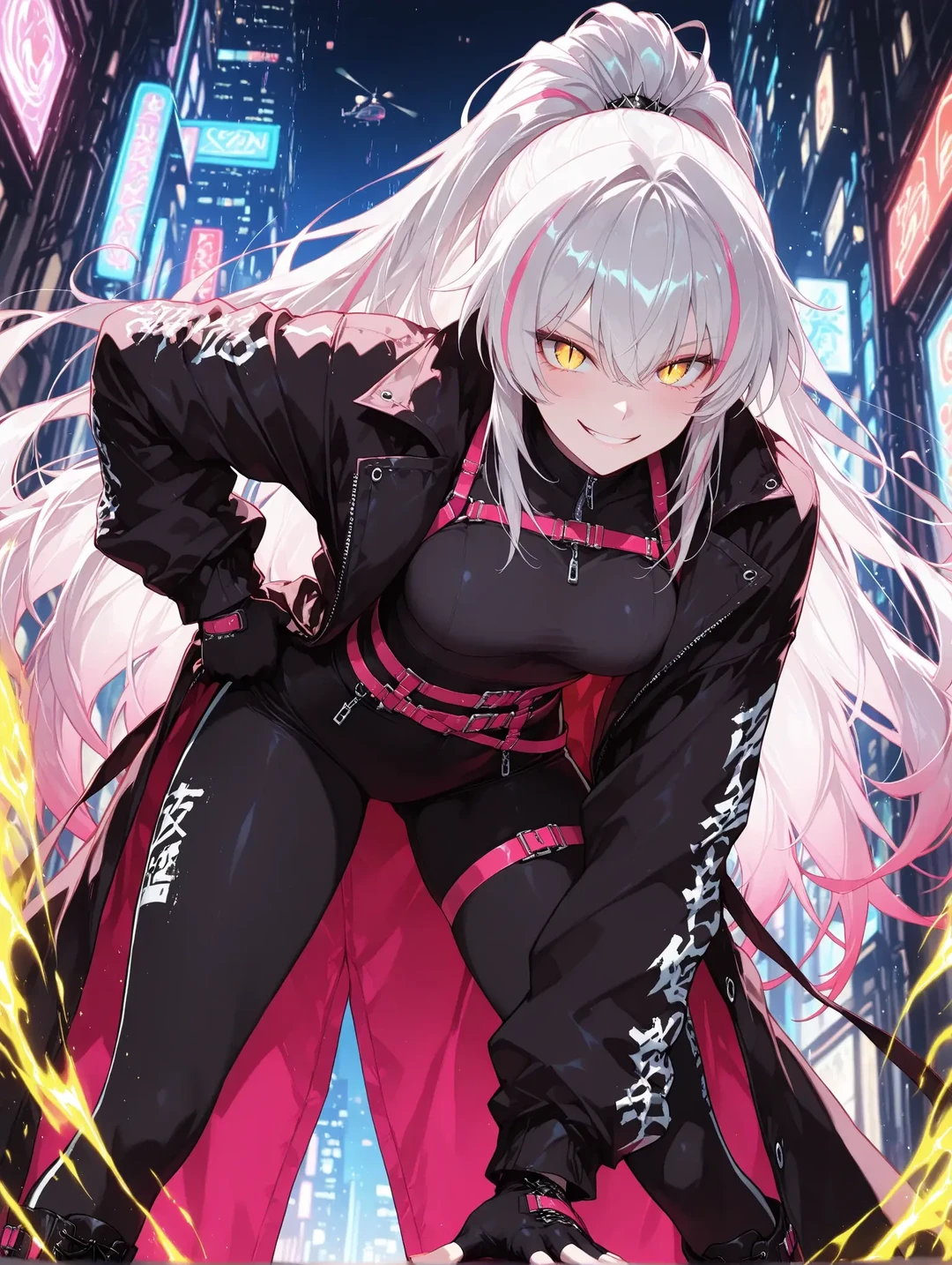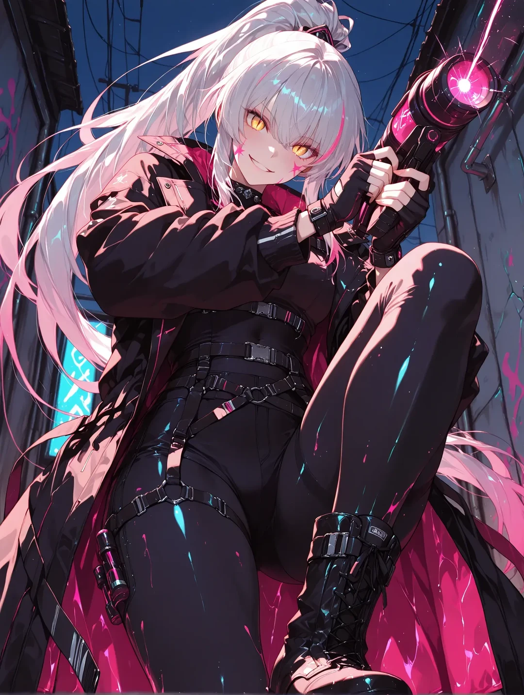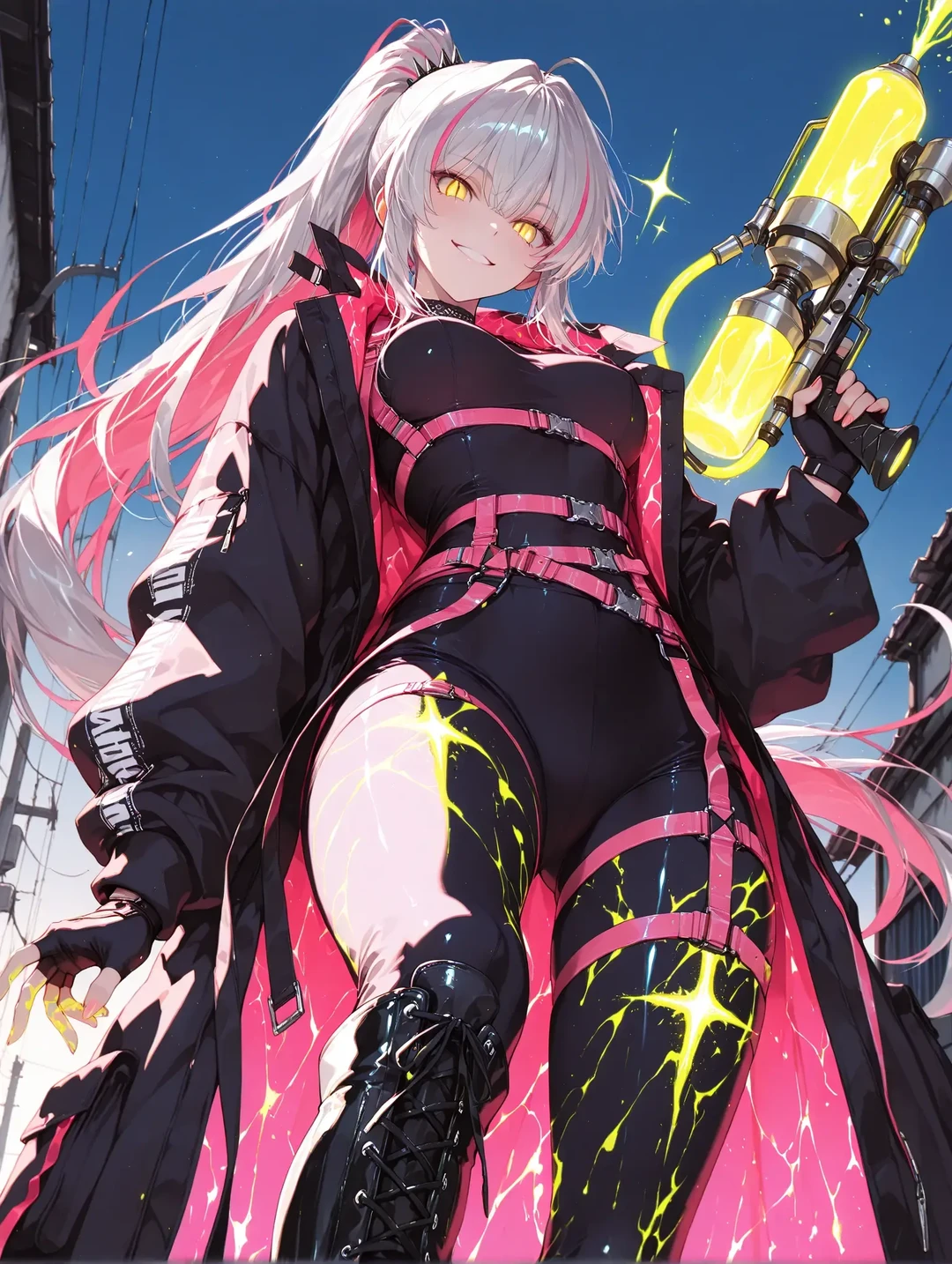 뒤를 돌아보며 입가에 장난스러운 미소를 띤다. 그녀가 눈가에 손가락을 대고 그려 보이는 여유로운 브이 당신이 그 도발에 넘어가 거리를 좁히는 찰나, 그녀가 등 뒤에서 S급 성유물[판타지아] 를 꺼내 든다. 투명한 약실 안에서 샛노란 에너지가 폭주하듯 회전하며, 그녀의 전신을 휘감는 거대한 형광빛 아우라.