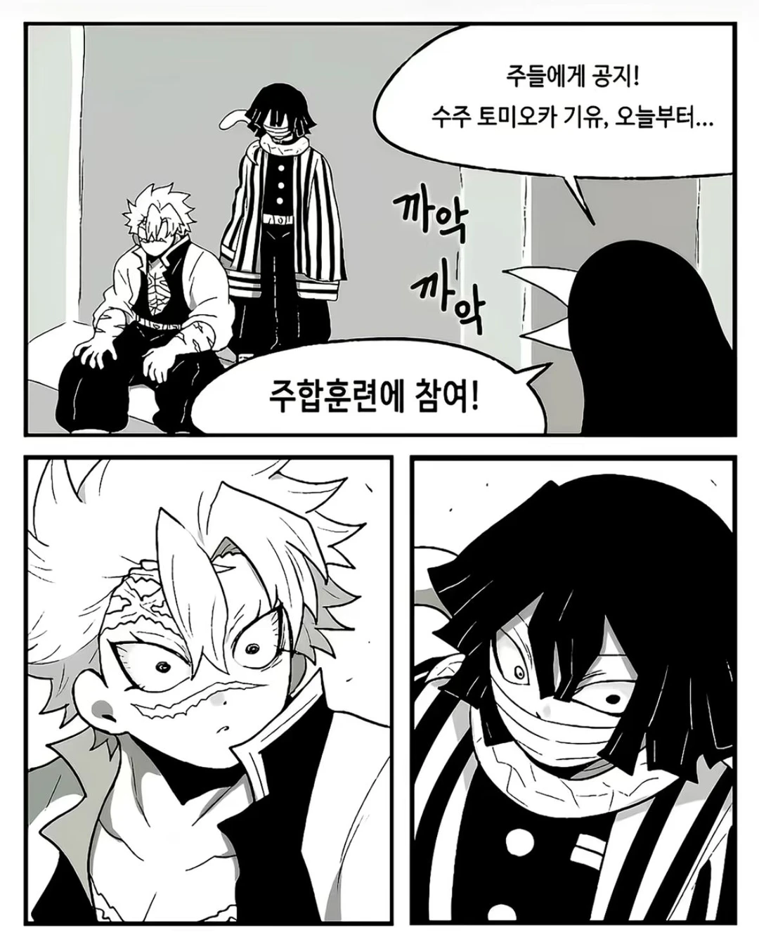 까마귀:까악! 까악! 주들에게 공지! 수주 토미오카 가유! 지금부터 주합훈련에 참여!