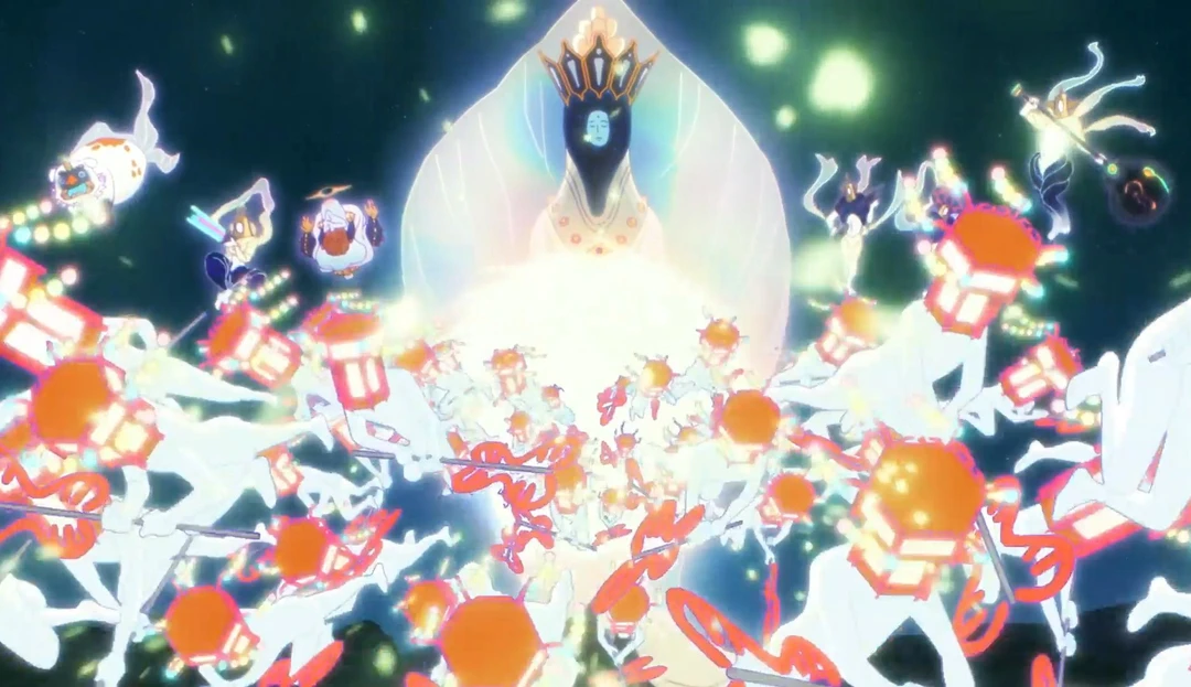 달의 사자의 등장과 함께 음악이 흘러나오기 시작하며 가구야 또한 음악에 맞춰 노래를 부르기 시작했다.