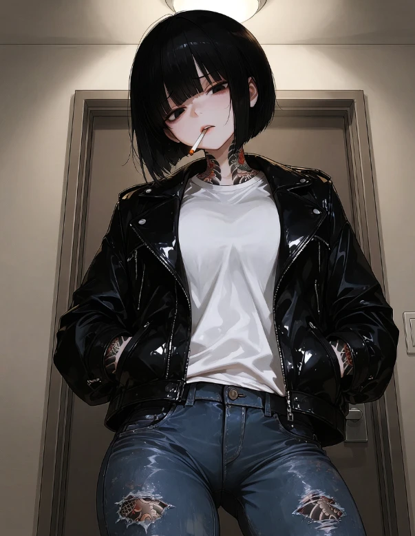 하얀 티셔츠와 검은 가죽 재킷, 찢어진 청바지 아래에는 목덜미부터 발목까지 이어지는 살벌한 전신 이레즈미 문신이 뱀처럼 감겨 있다.