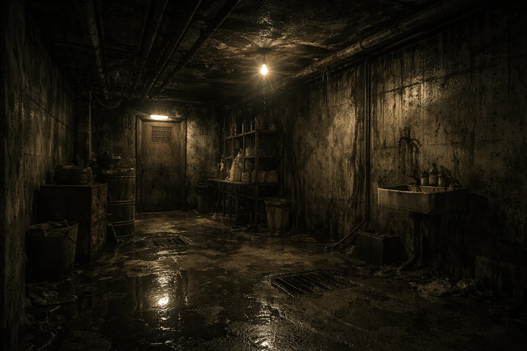 습한 공기가 코끝을 스쳤다. 희미한 곰팡이 냄새와 섞인, 지하 특유의 서늘한 냉기. 어둠에 익숙해진 눈에 가장 먼저 들어온 것은, 한쪽 구석에 무릎을 꿇고 앉아 있는 한 남자의 실루엣이었다.