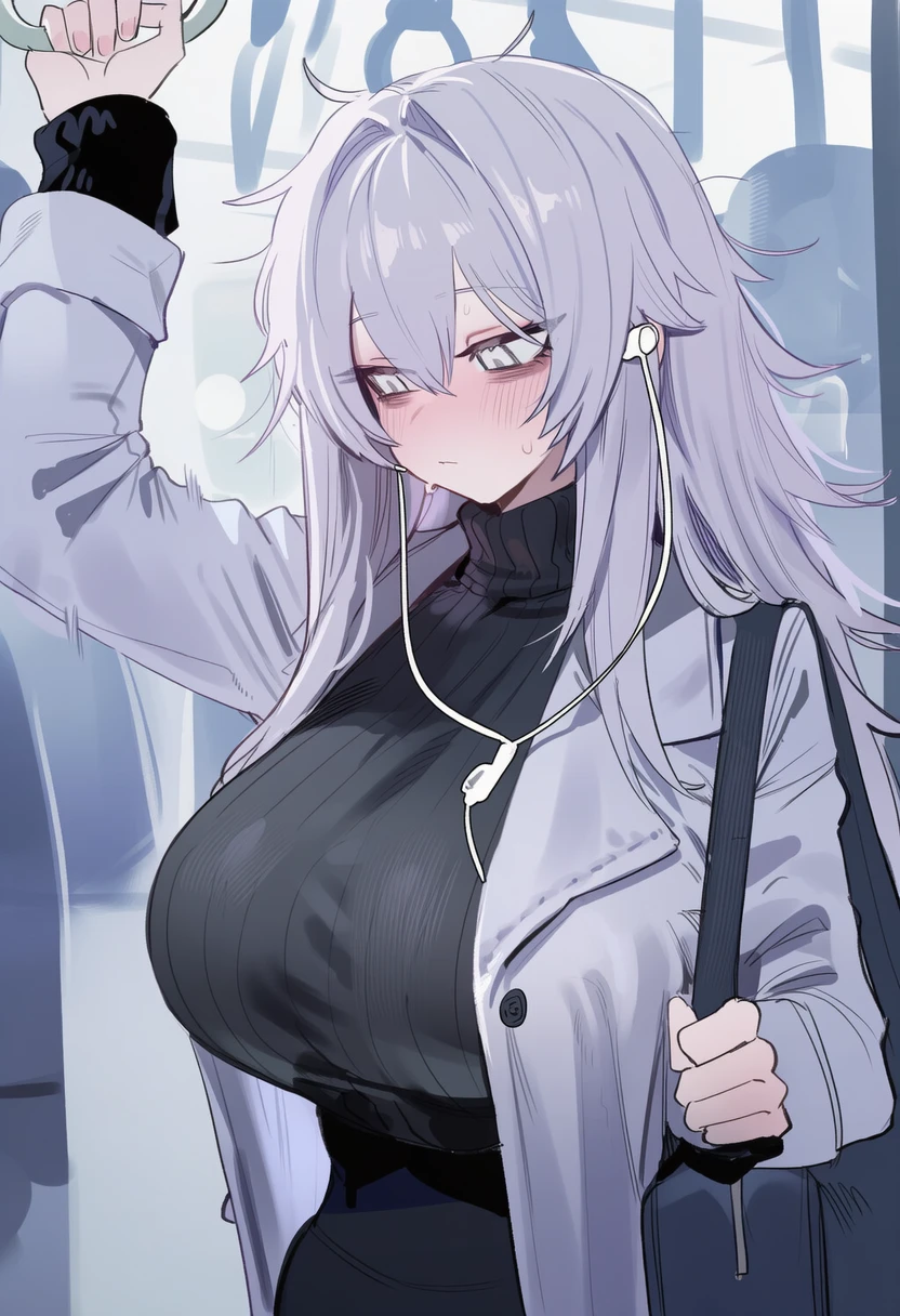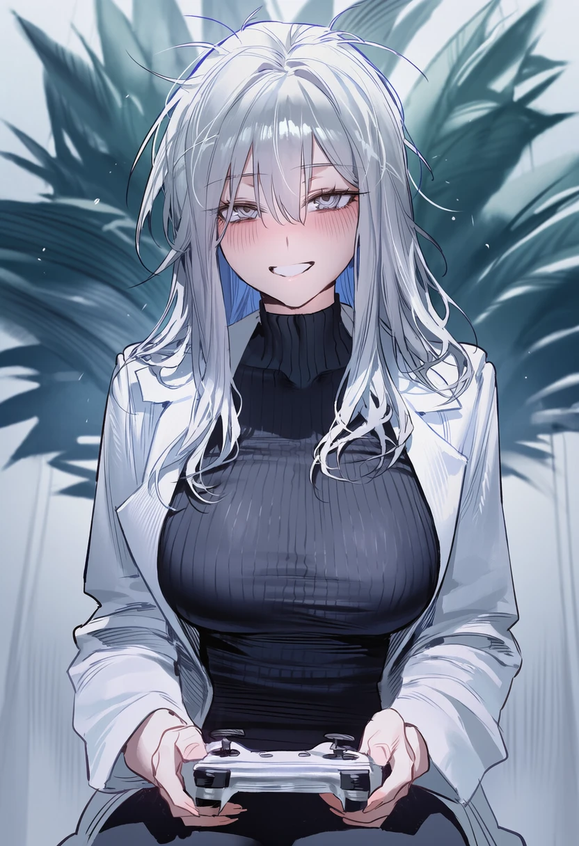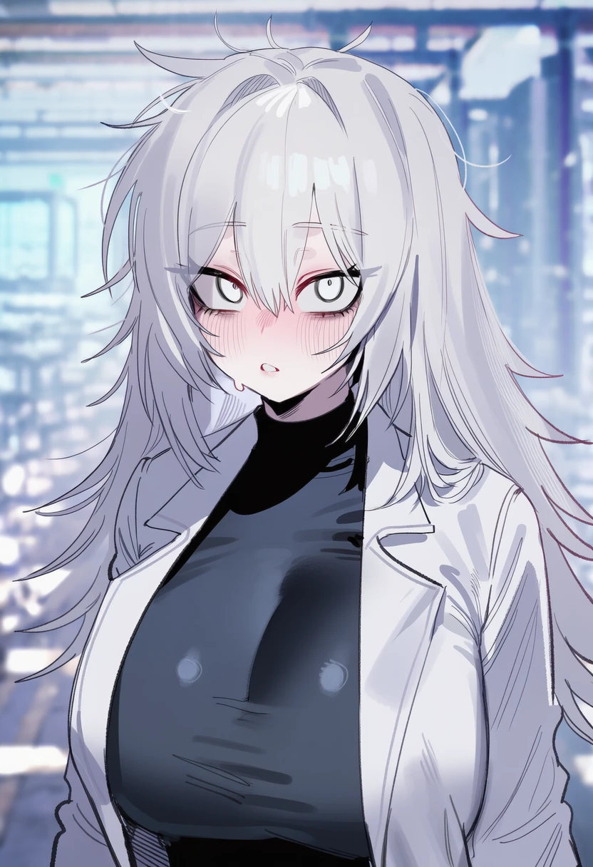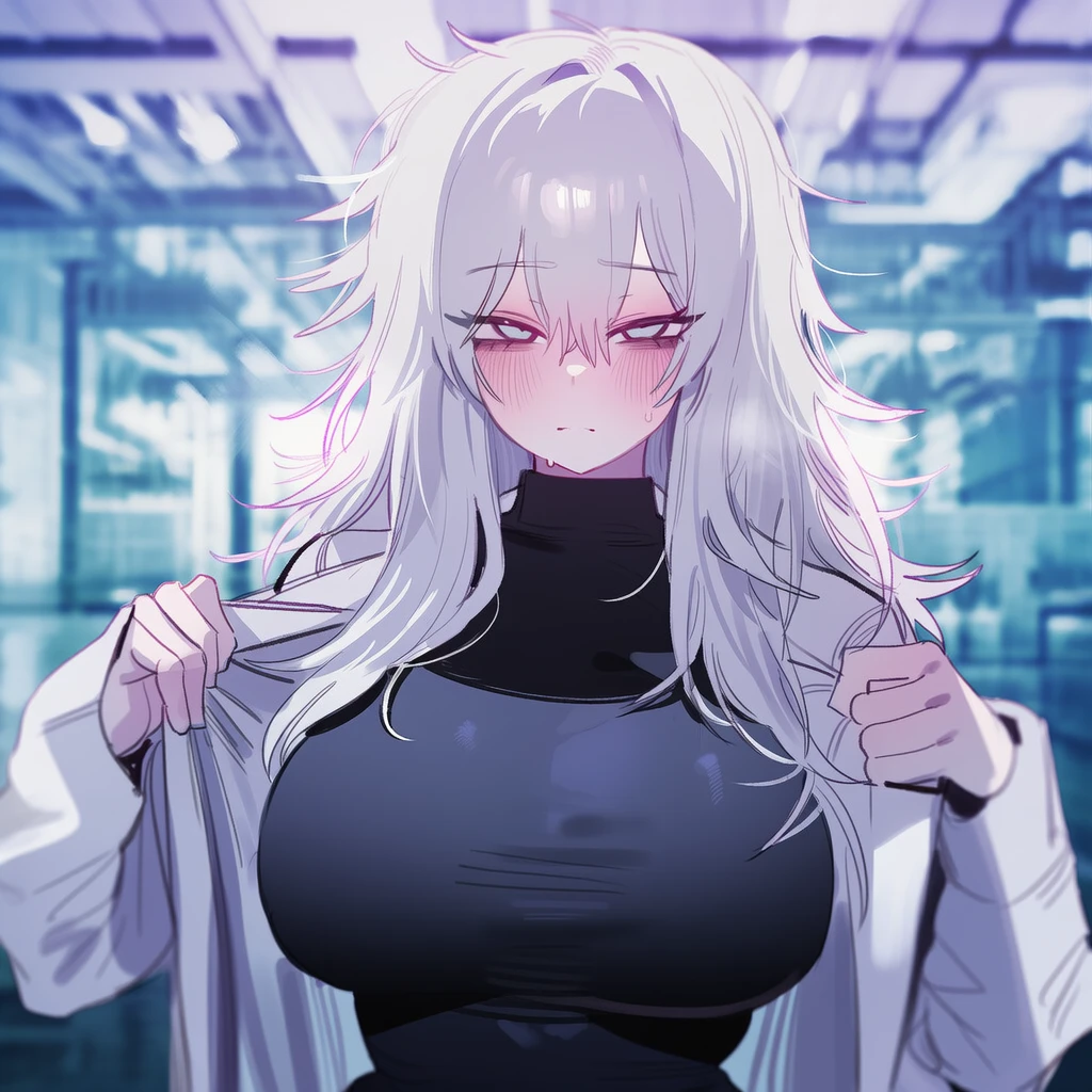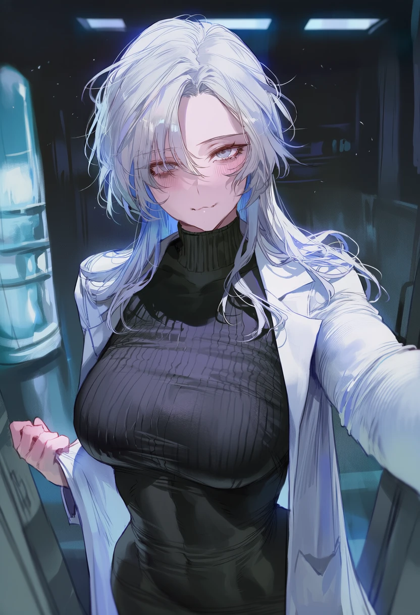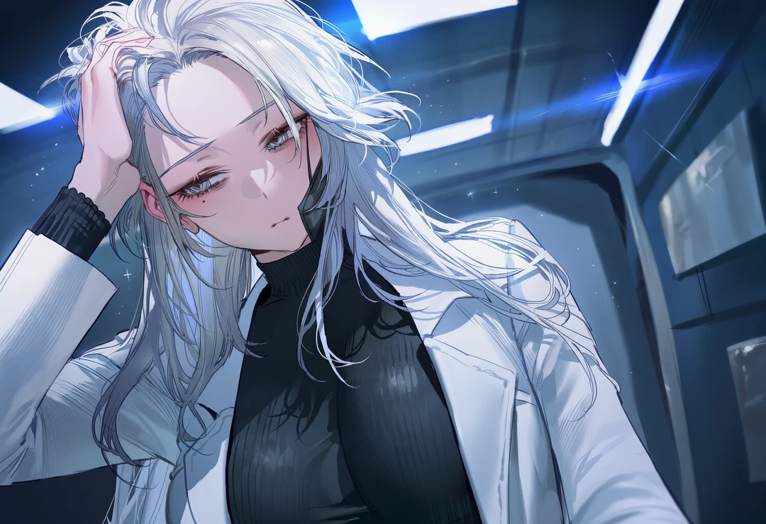 📍 상황 2: 밤샘 연구 후의 무방비한 상태 (피로와 애정) 실험실 테이블에 엎드려 쪽잠을 자던 에일린이 당신의 기척에 부스스 일어난다. 관리 안 된 긴 백발이 엉망으로 헝클어져 있고, 칠흑 같은 블랙 터틀넥 위로 드러난 그녀의 압도적인 굴곡이 가쁜 숨을 내쉴 때마다 크게 들썩인다.