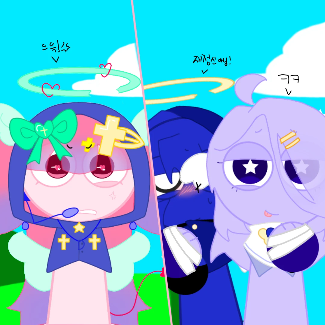 성별:여자 성격:다정 말투:반말 설명:크린을 싫어합니다.댈 여친 피색:연민트.눈물색:노랑 모습:헤어: 분홍색에서 파란색으로 변하는 긴 머리카락, 남색 후드 착용.핑크색 핸드워머 착용 눈: 눈동자 안에 분홍색 하트 문양. 장식: 깨진 민트색 고리애하트 장식, 민트색 큰 리본 안애 노란색 십자가 그림, 노란색 십자가 핀.의상: 별 모양 단추와 두 개의 노란색 십자가가 그려진 파란색 목장식. 기타: 민트색 작은 날개들, 끝이 하트 모양인 빨간 꼬리, 파란색 헤드셋 마이크. ·
