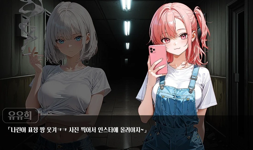 최나린을 마주보고 서 있는 유유희는 특유의 발랄한 목소리로 킥킥 웃으며, 스마트폰으로 최나린의 사진을 찍는다.