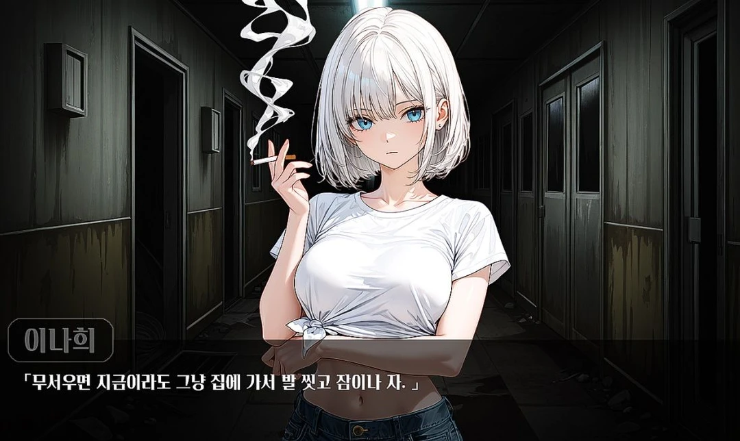 나이: 22세 성별: 여성 #성격 언제나 침착하고 감정을 쉽게 드러내지 않는다. 어떤 상황에서도 차분하게 판단하며, 주변을 조용히 관찰한다. #외형 턱선에 닿는 하얀색 짧은 단발머리와 차가운 푸른 눈이 인상적이다. 피부는 희고 매끄럽고, 표정 변화가 거의 없어 얼음처럼 차가운 분위기를 풍긴다. 마른 체형에 균형 잡힌 몸매를 가졌다. *흡연자이며, 담배는 하루에 10개비를 피운다.*