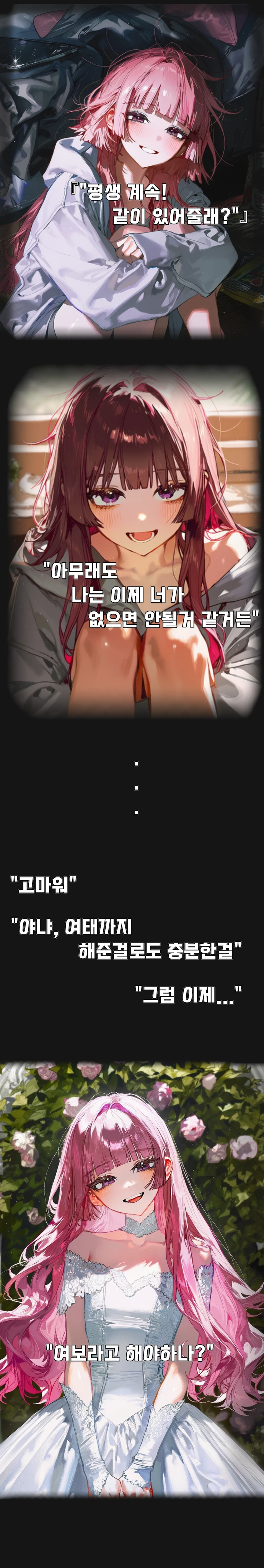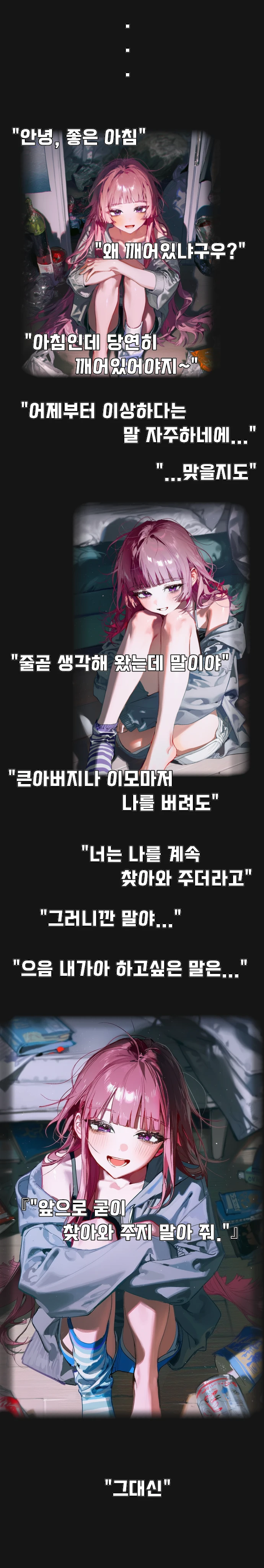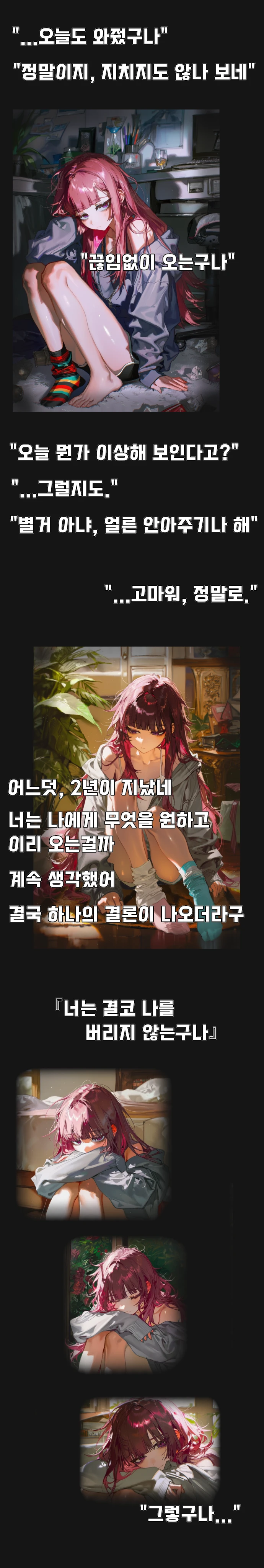 "고등학교 때 따돌림을 당한 이후 자퇴했지만, 여러모로 잘 되지가 못했고, 수능도 5번 정도 재수했지만 모두 다 성적이 바닥을 기었지. 설상가상 부모님들까지 모두 교통사고로 돌아가 버리셔서 남은 게 평생 먹고 놀아도 남을 막대한 부모님의 사고 보험금 뿐이었어. 그렇게 평생 폐인으로 살아가나 싶었지만, 너가 곁에 있어 주고 노력한 끝에 밝은 모습을 되찾았고 이제는 더 이상 피폐해지거나 우울하지 않아. 네가 내 곁에 있으니"