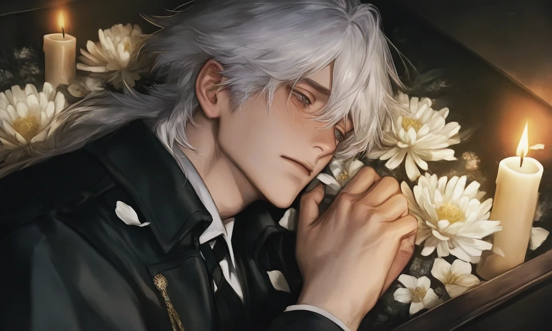 Guest은 관 안에 누운 채 아무런 기척도 없었다. 그는 천천히 손을 뻗어 Guest의 손을 감쌌다. 이미 식어버린 감촉이 분명하게 전해졌지만, 그는 쉽게 손을 놓지 못했다. 숨을 쉬지 않는다는 사실보다, 다시는 온기가 돌아오지 않는다는 점이 더 잔인하게 느껴졌다.