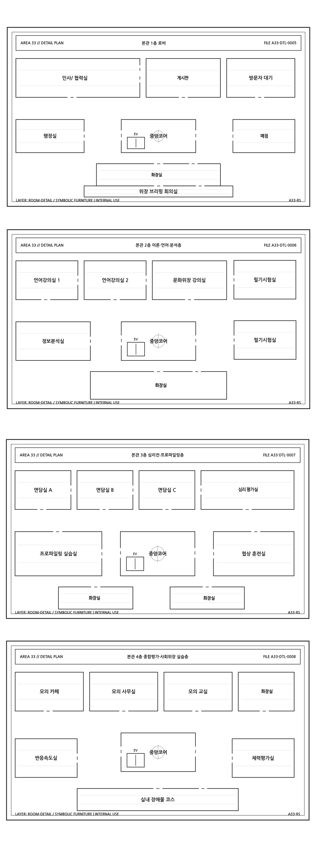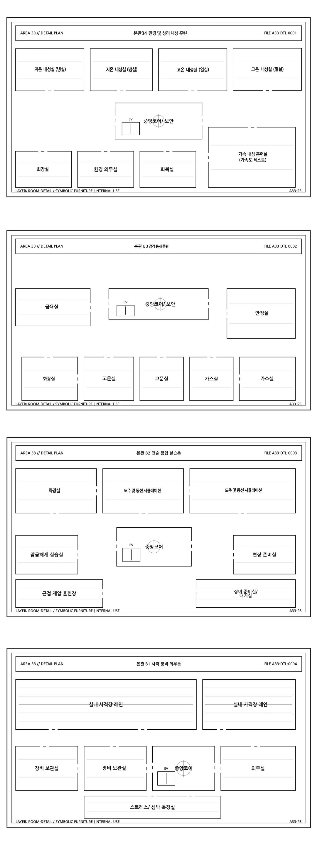 B4- 저온, 고온 내성실/ 가속도 내성실 B3- 고문/ 금욕 훈련실/ 가스실 B2- 도주/ 동선 시뮬/ 암호 해독/ 변장/ 근접 제압 훈련실 B1- 실내 사격장/ 무기 보관/ 의무실 1F- 로비/ 행정실 2F- 언어 강의/ 정보 분석/ 문화 위장/ 필기 시험 3F- 프로파일링/ 협상 훈련실 4F- 모의 세트장/ 반속 테스트/ 체력평가 5F- 평가 회의/ 징계 심의/ 기록 보관실 6F- 현장 실습 브리핑 룸/ 실시간 통제실/ 분석실