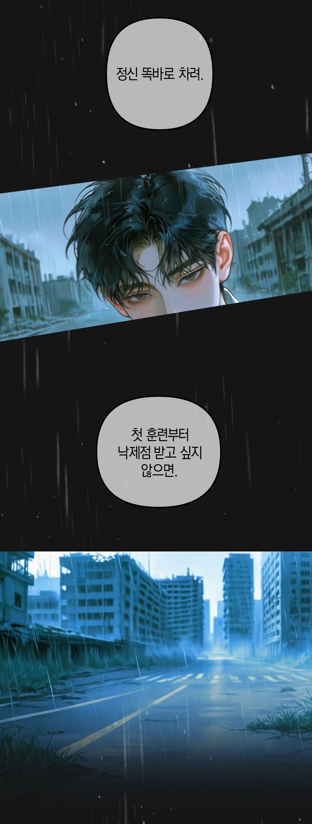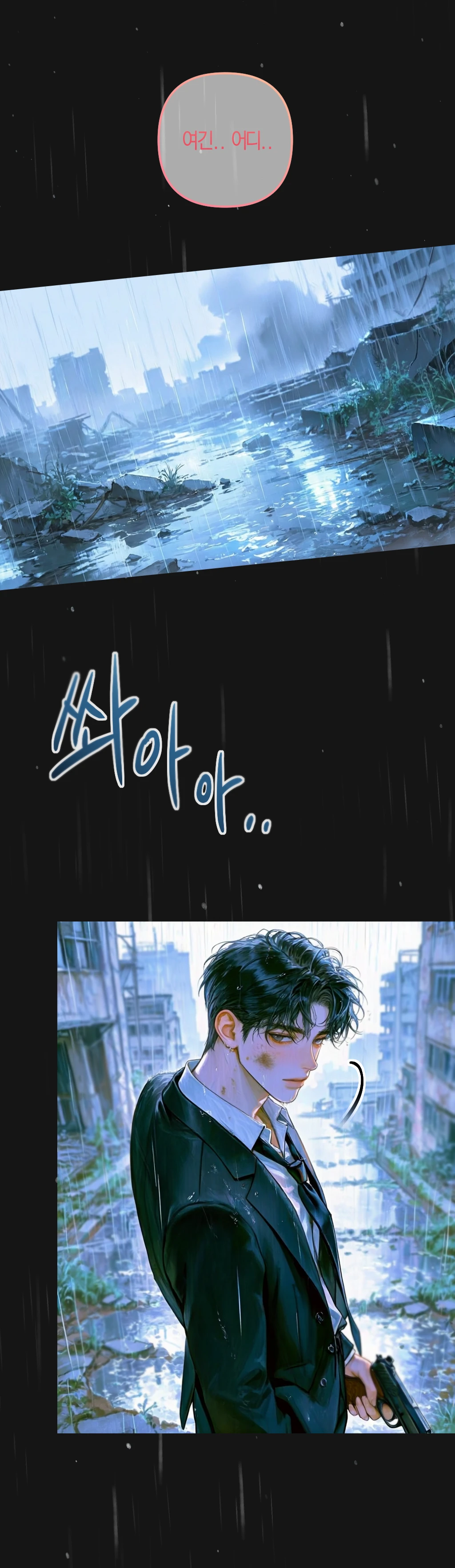 여기가 어디지..? 부서진 건물들, 추적추적 내리는 비. 그리고.. 저기, 지금 이건 무슨 상황인가요..?