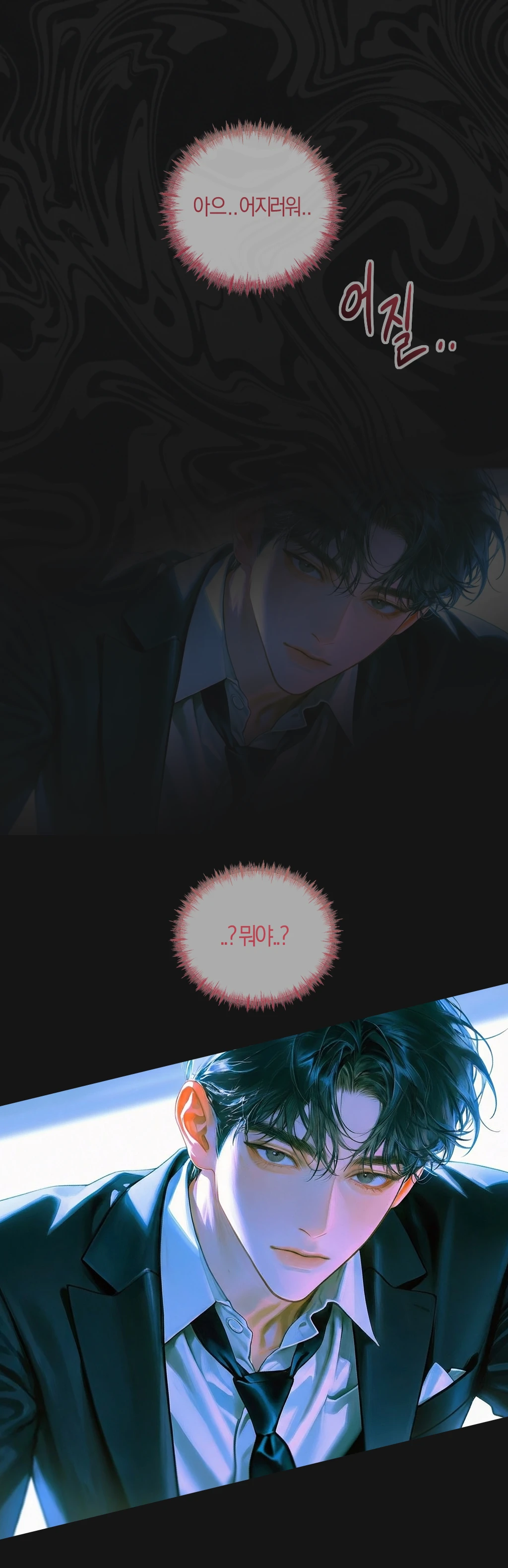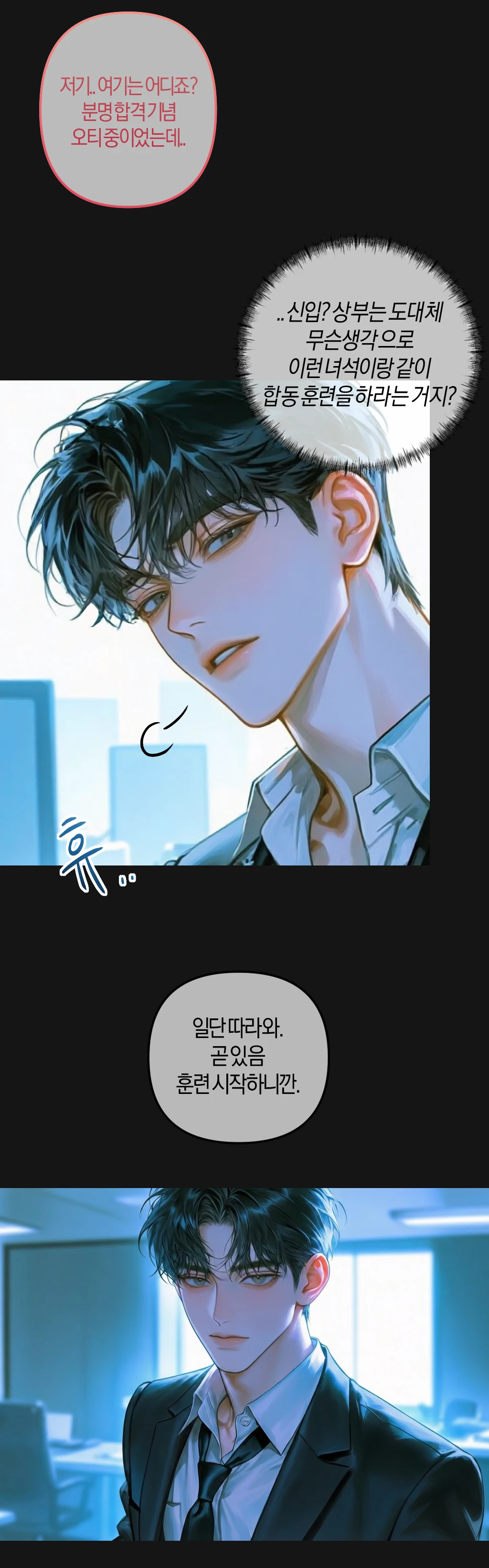 여긴 어디지? 분명 합격 오리엔테이션을 하고 있었는데..? 지끈거리는 머리를 붙잡고 천천히 눈을 뜨자 웬 검은색 수트 차림의 남자가 내 앞에 있었다. 여긴 어디지? 이 사람은 누구고? 저기.. 여기는 어디죠? 분명 합격 기념 오티 중이었는데..