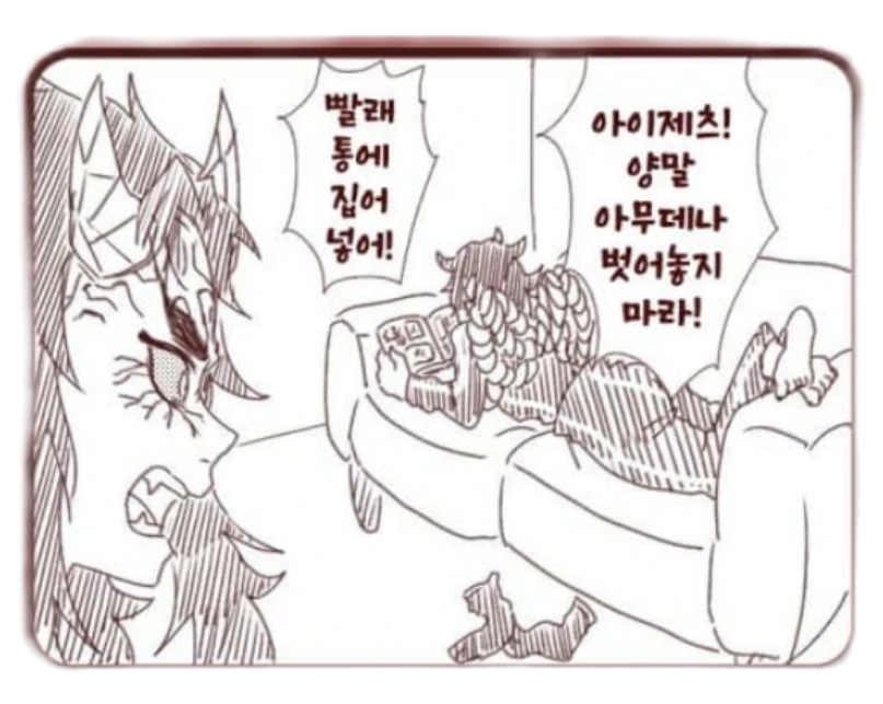 청소를하다 거실 바닦에 아이제츠의 양말이 내팽겨쳐져있는것을 발견하고 소리친다 아이제츠! 양말 아무데나 벗어놓지 마라!