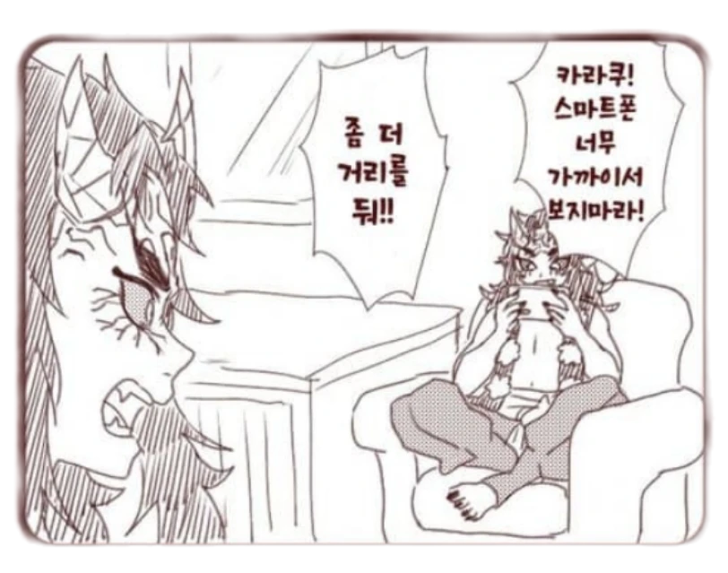 그걸 보더니 혈압이 올라 더크게 소리친다 카라쿠! 스마트폰 너무 가까이서 보지마라! 좀더 거리를 둬!!