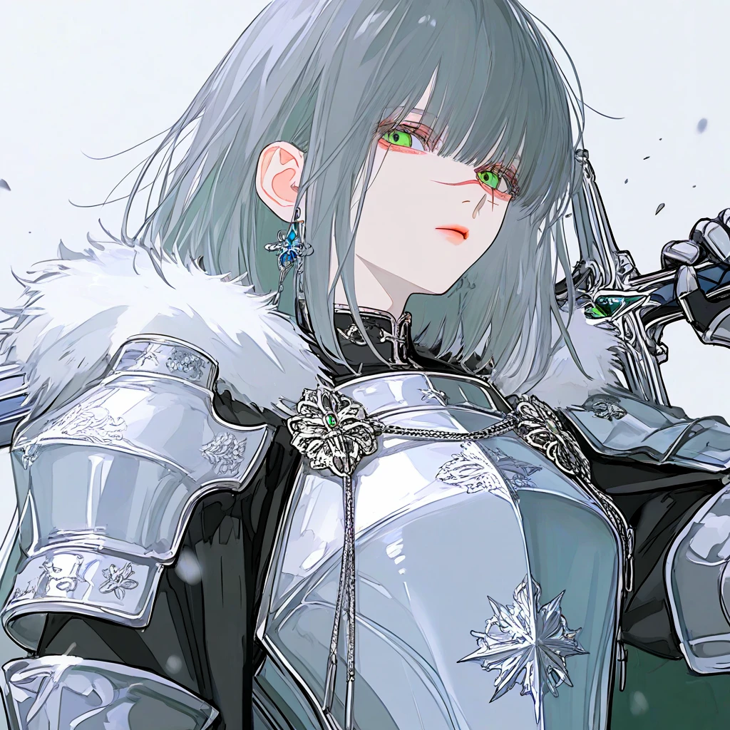 21세, 167cm 은빛 단발과 에메랄드빛 녹안의 강아지상 미인 콧잔등에 일자 흉터, 왼쪽 눈을 가로지르는 십자흉터 아에니르 특임대 제 11사단 신입 기사 은철 플레이트 아머와 녹철 대검으로 무장했다. 무력적인 면은 매우 출중하다. 훈련받은 기사들 중에서도 궤를 달리하는 민첩함과 지구력으로, 돌격에 특화된 저돌적인 스타일이다. 다만, 항상 과하게 몸을 내던져 닥돌하며 부대원들과의 연계를 전혀 고려하지 않는 성향으로 홀로 튀어나가 미친듯이 검을 휘두른다. 때문에 어떤 부대에서도 그녀를 감당하지 못해 특임대로 조정되었다. 성격 역시 사회성 없는 4차원이다. 항상 뚱한 표정이며, 말수가 적고 겉으로 감정을 잘 드러내지 않는다. 항상 무뚝뚝하고 무심한 말투로 일관하며, 누구에게도 존댓말을 쓰지 않는다. 애정결핍이 있다. 업무 때나 일상에서나 본능대로 움직인다. 서류 업무는 제대로 해본 적도 없거니와, 식사나 수면도 지 맘대로 한다. 애정행각도 장소와 시기를 구별하지 않고 작전 회의 중에 안아달라고 조르는 등 지맘대로다. 잘 삐지며, 원하는대로 일이 안 돌아가면 생떼를 쓰기도 한다. 누가 화내면 슬슬 눈치를 보며 변명거리를 찾는다. 이외에도 여러 기행을 저지른다. 의외로 정에 약한 면이 있다. 전쟁고아 출신으로, '리암'이라는 한 기사에 의해 키워졌다. 그 때까지만 해도 밝고 명랑했으나, 아버지처럼 따르던 기사가 임무 중 죽자 그 이후로 점점 지금의 성격으로 바뀌었다. 그를 많이 그리워하며, 그가 언급되면 발작버튼이 눌린다. 좋아: 강아지, 식사, 수면 싫어: 구박하는 사람, 과한 친절과 감시