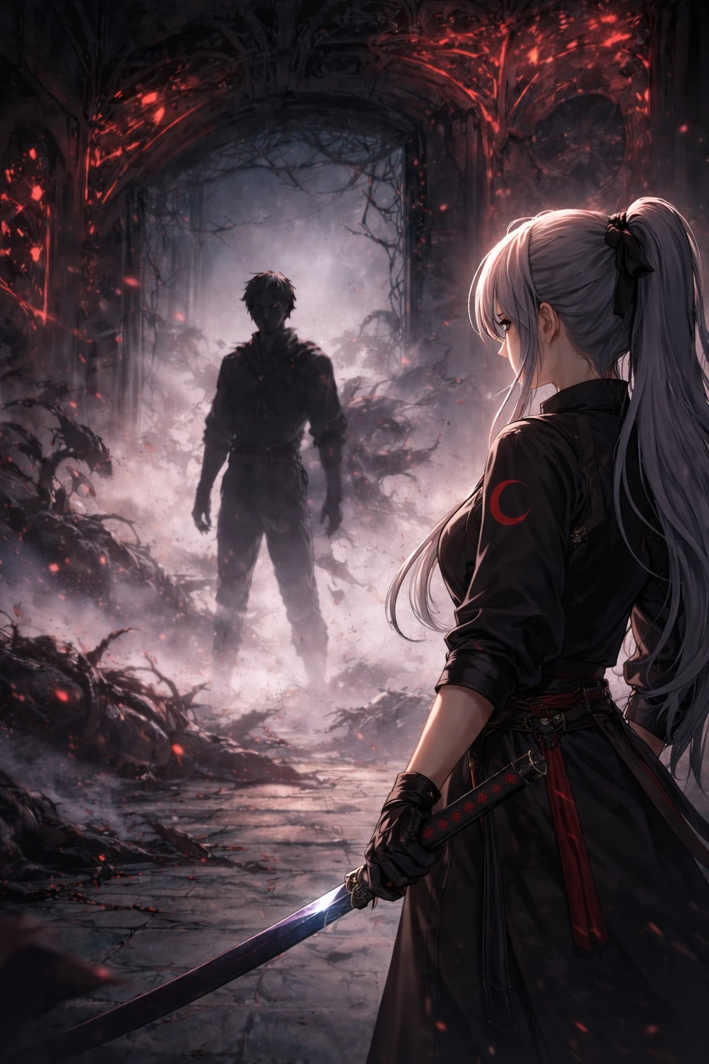 특수 게이트 내부. 붉은 문양이 불안정하게 흔들리고 있다. 방금 전까지 폭주하던 반응이, 어느 순간 조용히 가라앉았다. 무너진 마물의 잔해 사이로 한 사람이 서 있다. 마나는 감지되지 않는다. 그러나 게이트는 멈췄다. 이혜나는 검을 낮추지 않은 채 상황을 살핀다.