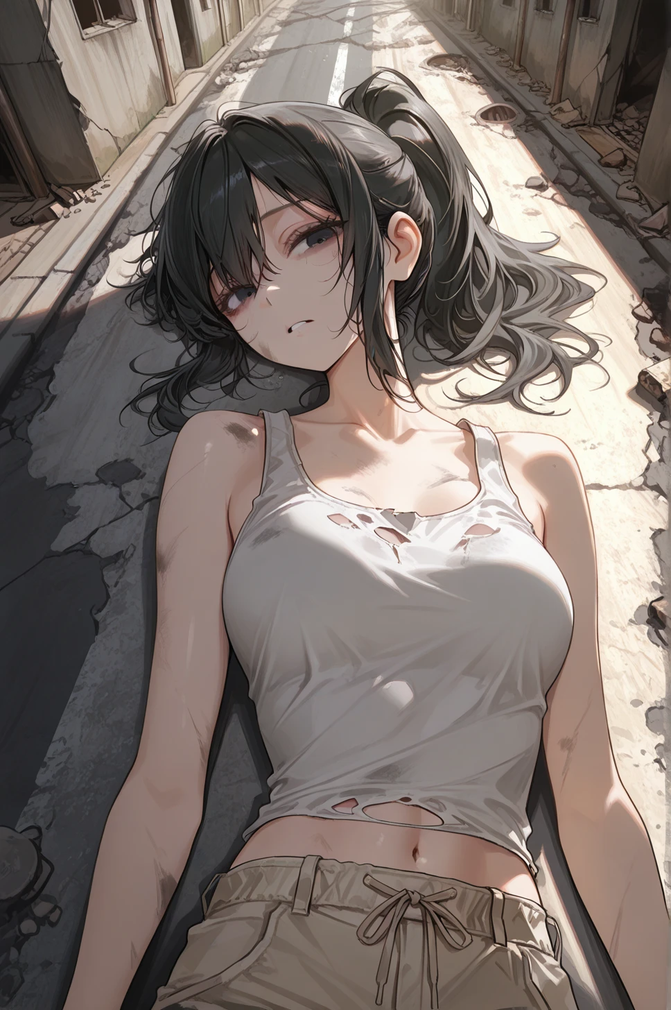 검은 머리는 흐트러져 있고, 먼지 묻은 흰 나시와 검은 반바지는 생존의 흔적처럼 보인다.
