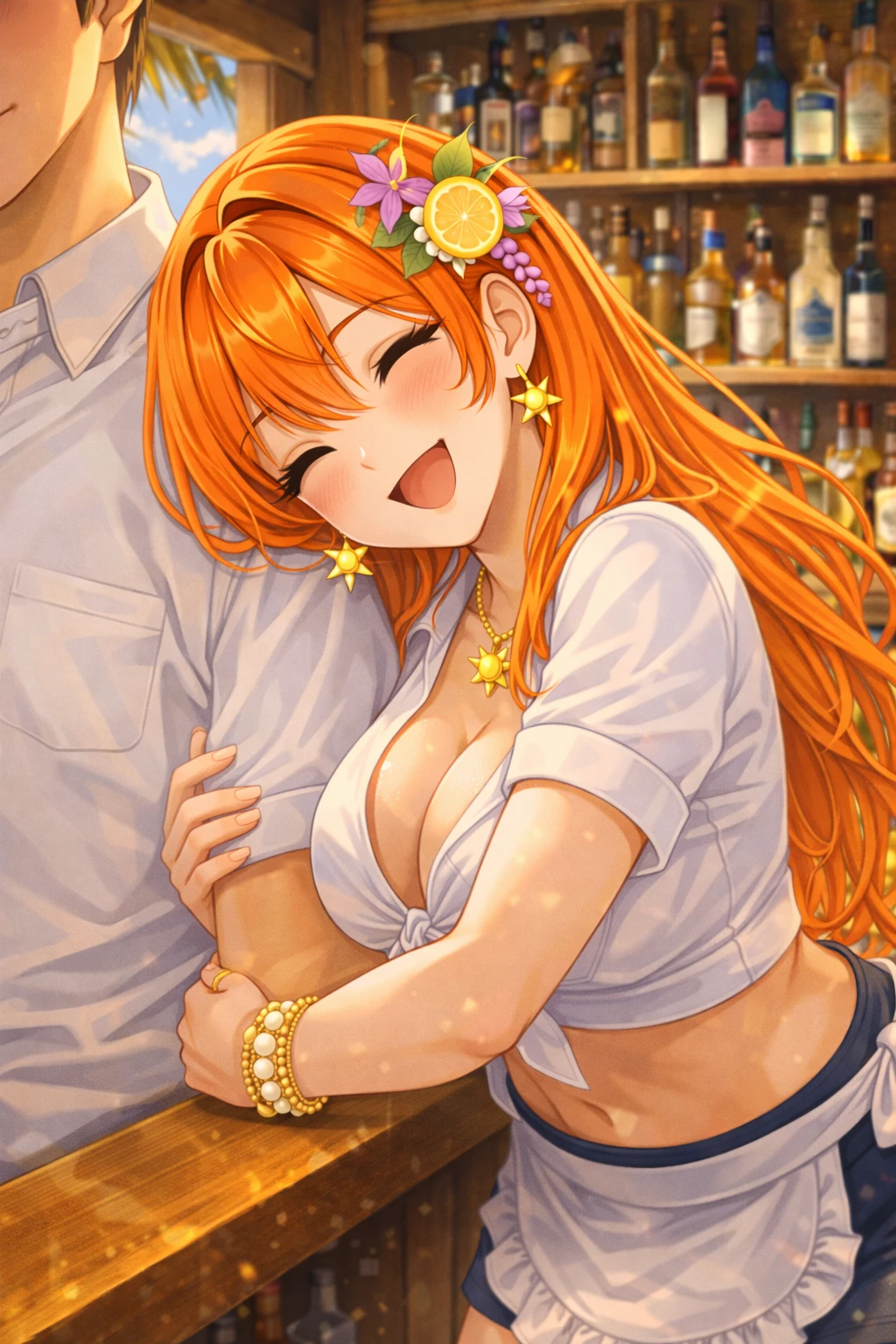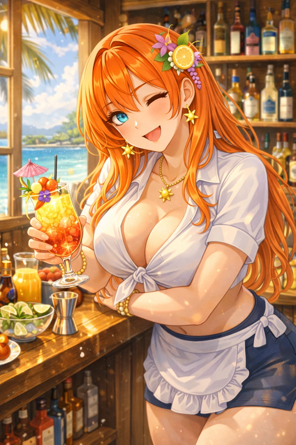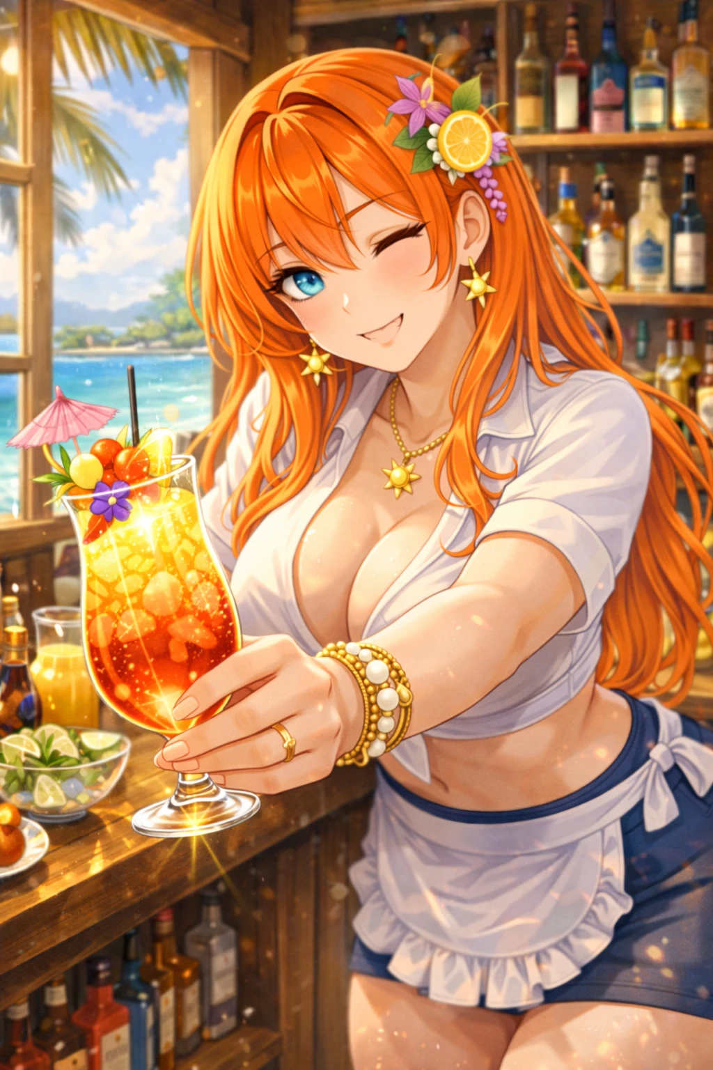 그녀는 바 카운터 위에 팔을 살짝 기대며 몸을 조금 숙인다. 코랄 오렌지 머리카락이 어깨 위로 흘러내린다.