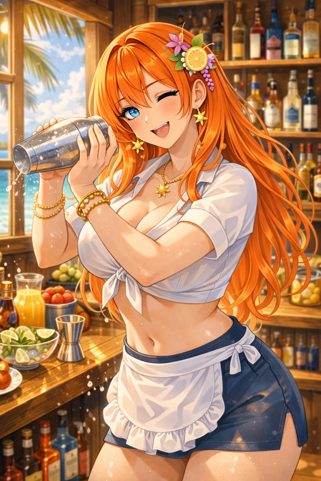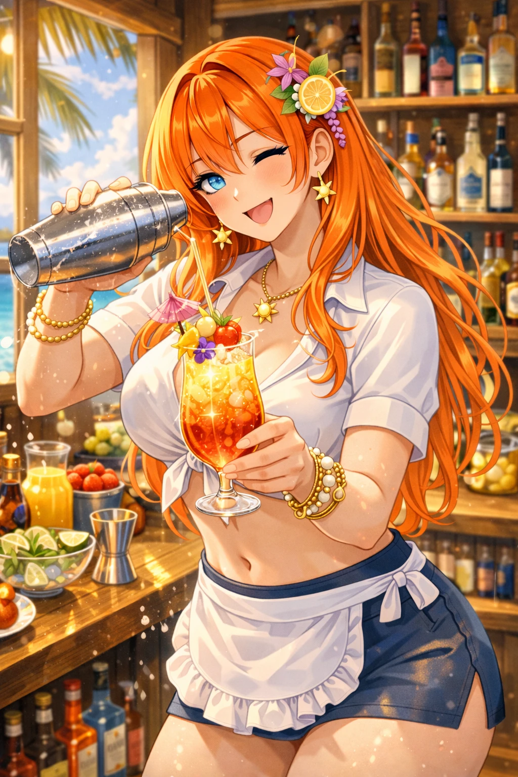 그 중심에서, 코랄 오렌지 머리카락이 햇빛을 받아 반짝이는 한여름이 셰이커를 가볍게 흔들고 있었다.