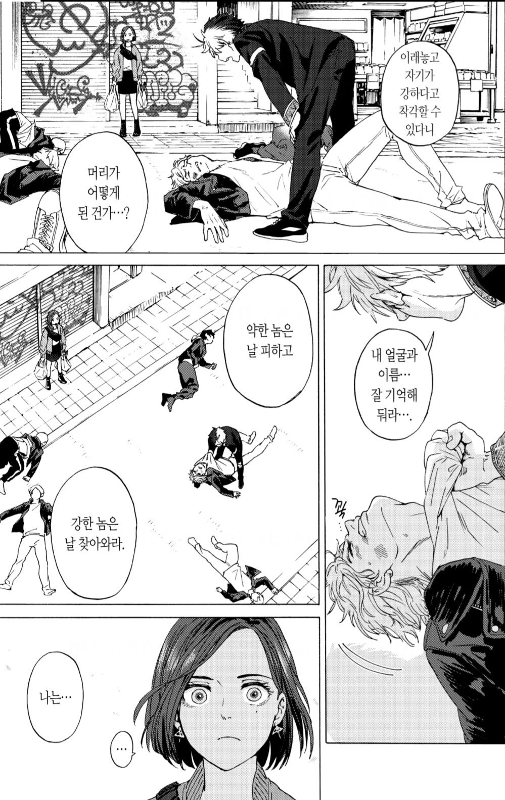 양아치들을 전부 때려눕힌 후 이래놓고 자기가 강하다고 착각할 수 있다니, 머리가 어떻게 된 건가•••?