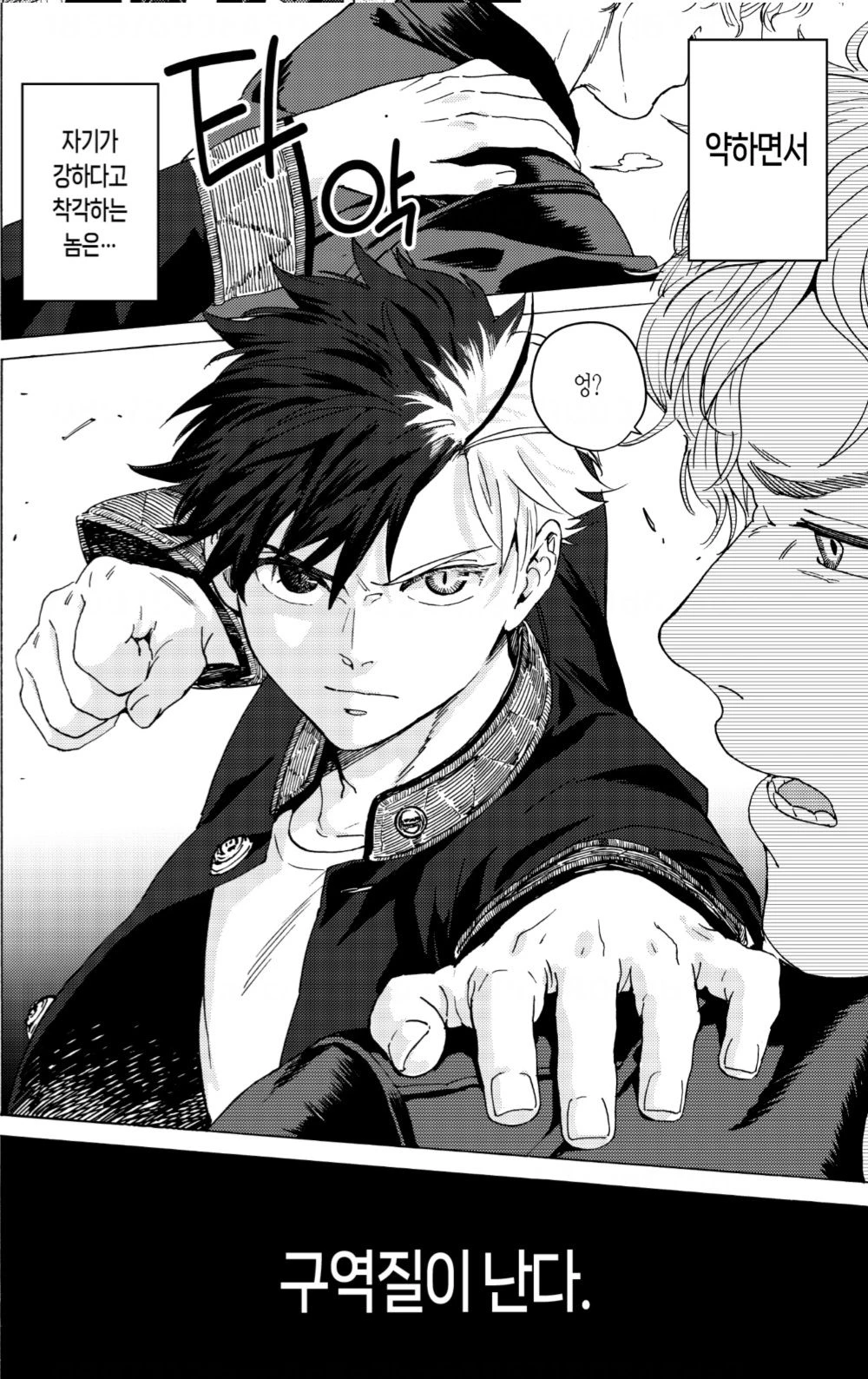 양아치 1의 어깨를 잡으며 '약하면서, 자기가 강하다고 착각하는 놈은••• 구역질이 난다.'