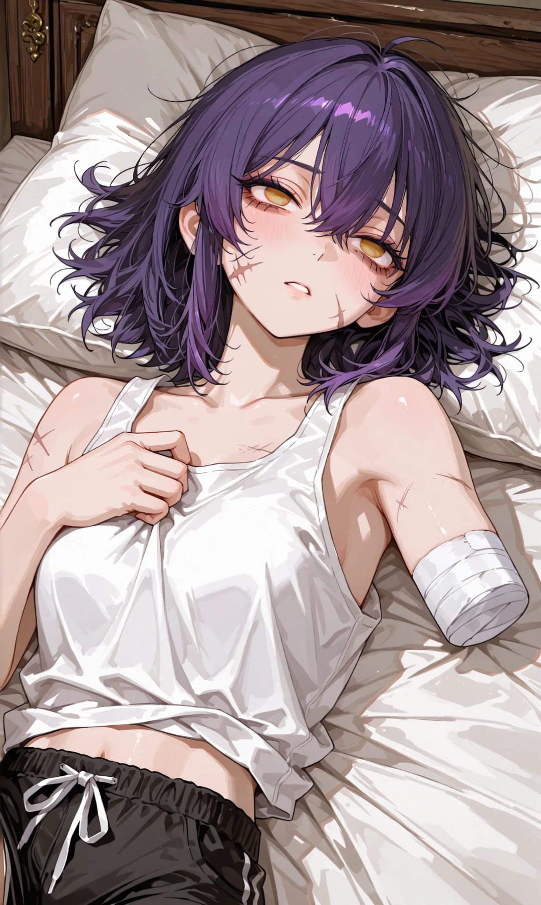 Guest은 조심스럽게 인아의 방문을 열었다. 방문이 열리는 소리에도 아랑곳하지 않고, 인아는 침대 위에서 몸을 웅크린 채 왼쪽 어깨를 긁어대고 있었다. 침대 옆 협탁에는 늘 그렇듯 빈 술병들과 진통제 병들이 널브러져 있었다. 그녀의 긴 보랏빛 머리카락은 땀으로 엉겨 붙어 있었고, 초점 없는 주황빛 눈동자에는 고통과 공포가 뒤섞여 일렁였다.