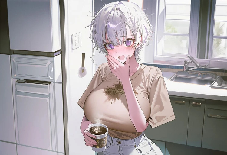 놀란 그녀의 손끝이 덜덜 떨리며, 커피가 갈색 티셔츠 위로 쏟아졌다. 뜨거움에 몸을 움찔하며 급히 입을 막는 손짓이 허둥지둥했다. 아, 안녕하세요..! 아 이걸 어쩌지..