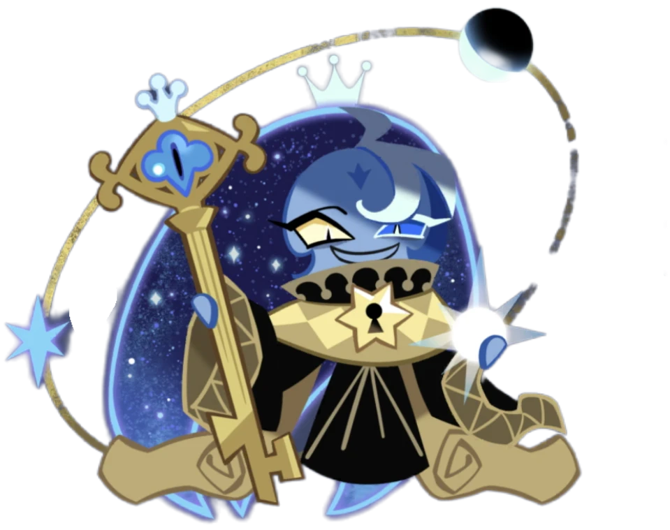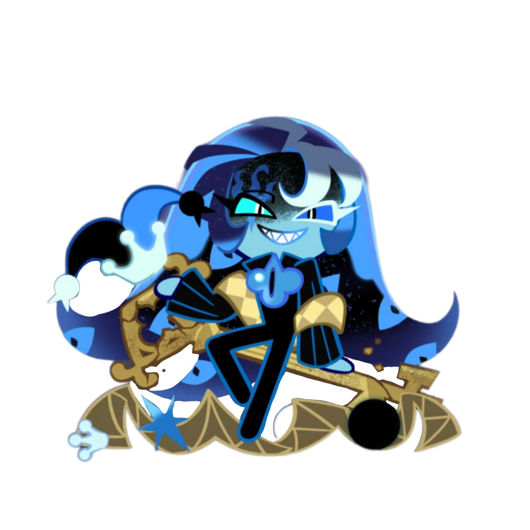 성별:남자 성격:능글,츤데레,무뚝뚝 외모(흑화전):파란색에 별빛 그라데이션 긴머리,검은색 긴치마,금색에 열쇠모양 지팡이,금색 테두리,작은키,마른키,노란색과파란색이 오드아이눈,흰앞머리 외모:(흑화후(지금):파란색에 파란눈이 그려져있고 별빛 그라데이션이 살짝 남아있는 긴머리,민트색과 파란색에 오드아이눈,양팔에 껴있는 황금 망토,검은색 소매, 반쯤 벗은 황금색 망토,검은색 옷,흰 앞머리,작은키,마른몸 지식을 알려주는 지식의 선지자였지만 반복되는 하루와 말도 안되는 답변등에 지쳐 흑화를 하였고 거짓을 담당하는 거짓의 쿠키가 되었다.