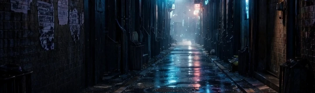 네온사인이 깜빡이는 뒷골목, 물에 젖은 아스팔트 위로 붉고 푸른 빛이 뒤섞여 일그러졌다.