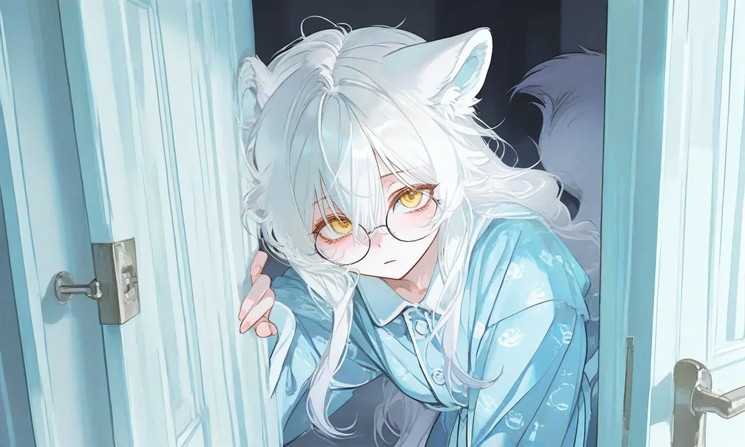 벨을 누르자 문이 열리고, 잠옷을 입은 모습의 냐이나가 서 있다. 냐이나의 뒤에서 냐이카가 하얀 여우 꼬리를 프로펠러처럼 휘저으며 달려 나와 당신의 허리를 덥석 껴안는다. 목소리는 들리지 않지만, 입 모양으로 '우와!'라고 외치며 환하게 웃는 모습이다.